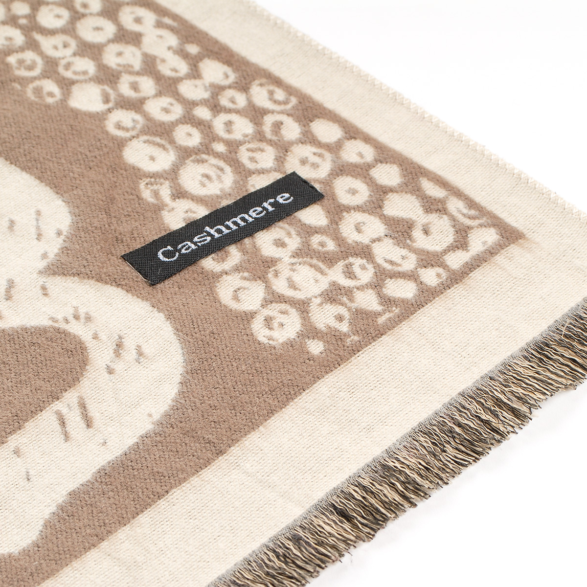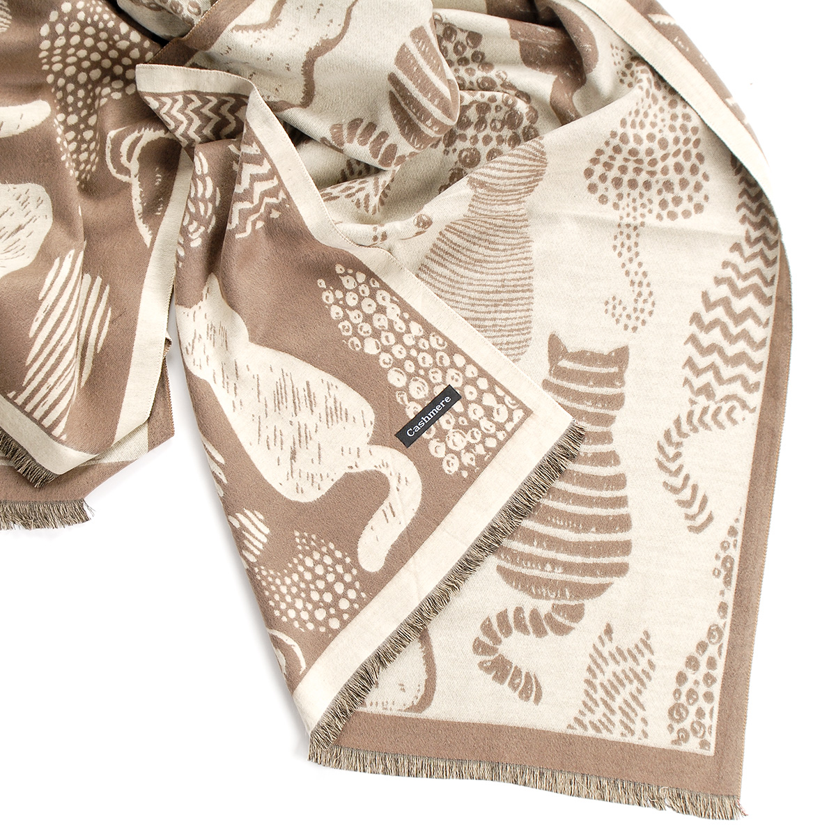 Teplá zimnášála obustranná se vzorem siluety koček, koťátek a kočiček v barvách krémové a camel hnědé. Šála má oboustranný vzor pozitiv/negativ, má jen malé cca 15 mm dlouhé třásně, je měkka, hebká a velmi příjemná na omak.