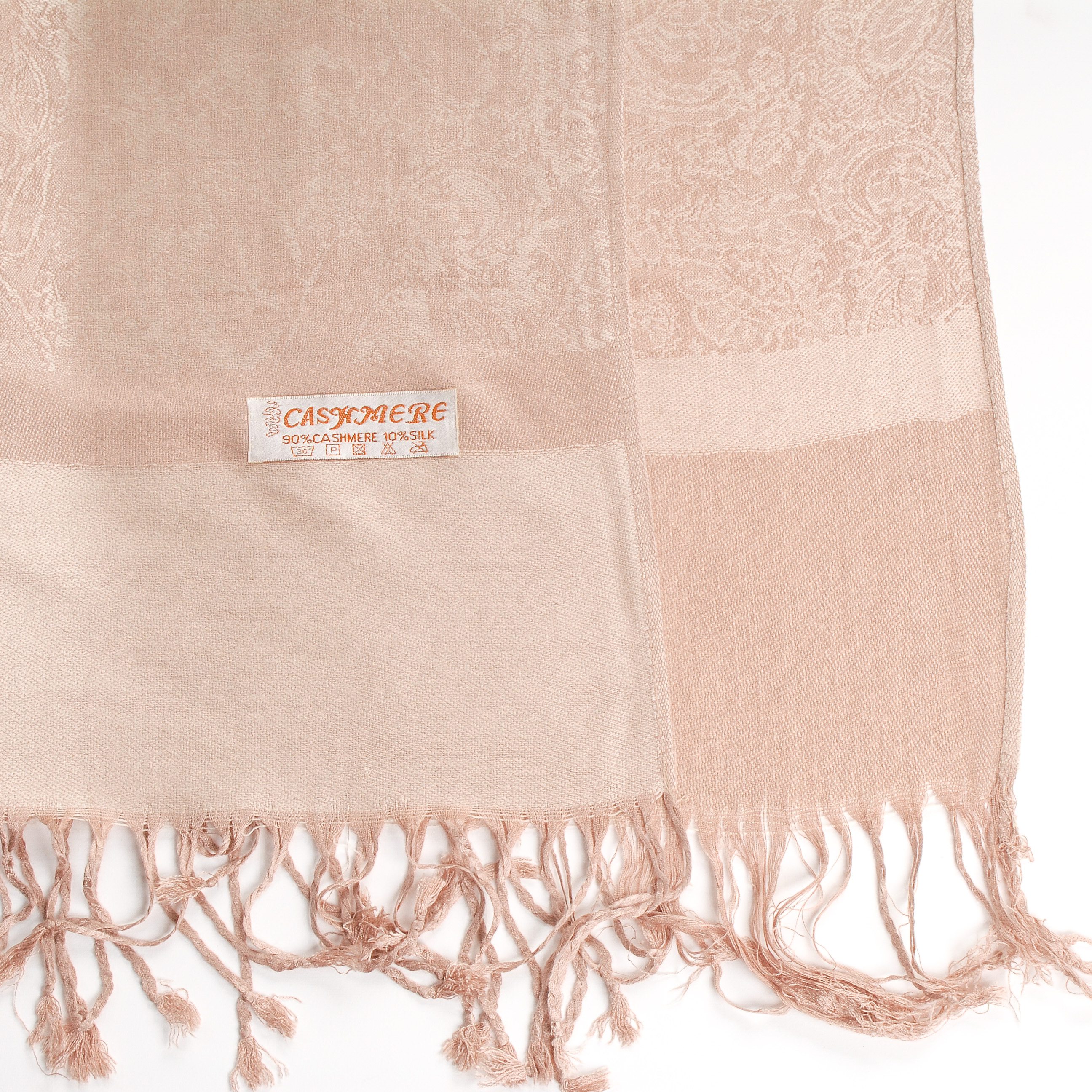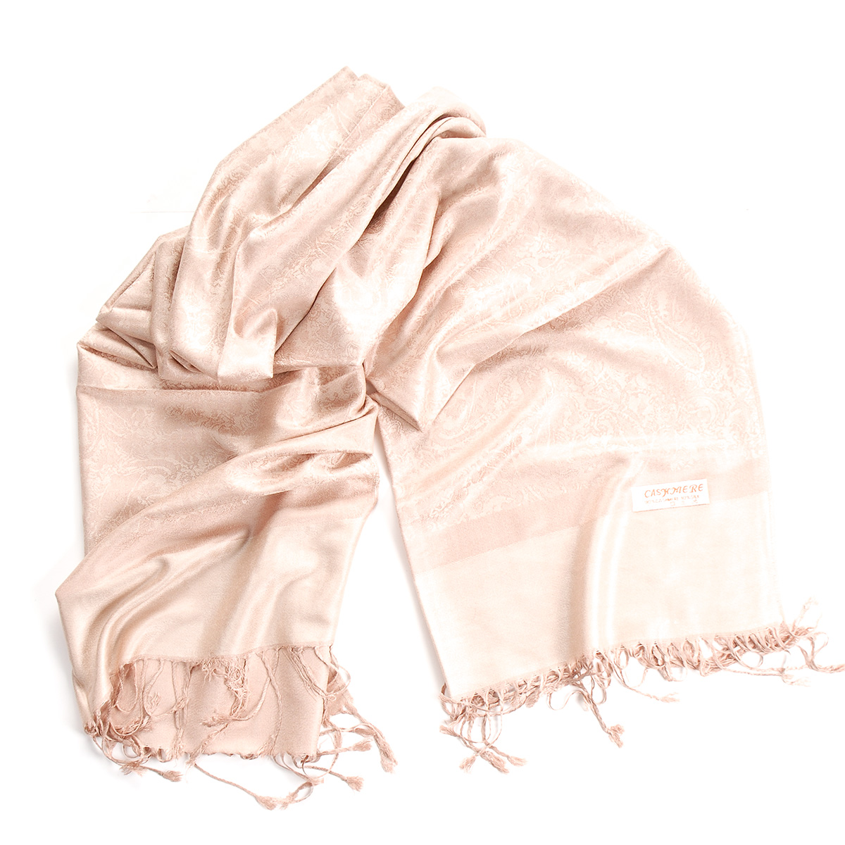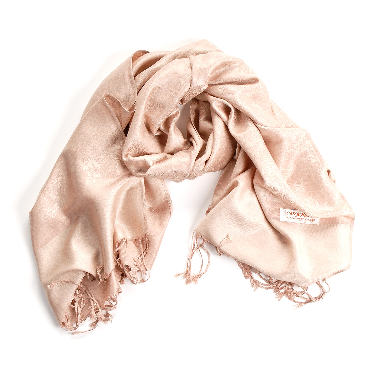 Elegantní teplá šála s třásněmi směs vlna kašmír s hedvábím a žakárovým paisley vzorem v béžovohnědé barvě. Śála je zakončena třásněmi, je měkka a hebká na omak, je velmi hřejivá a vzor je oboustranný.