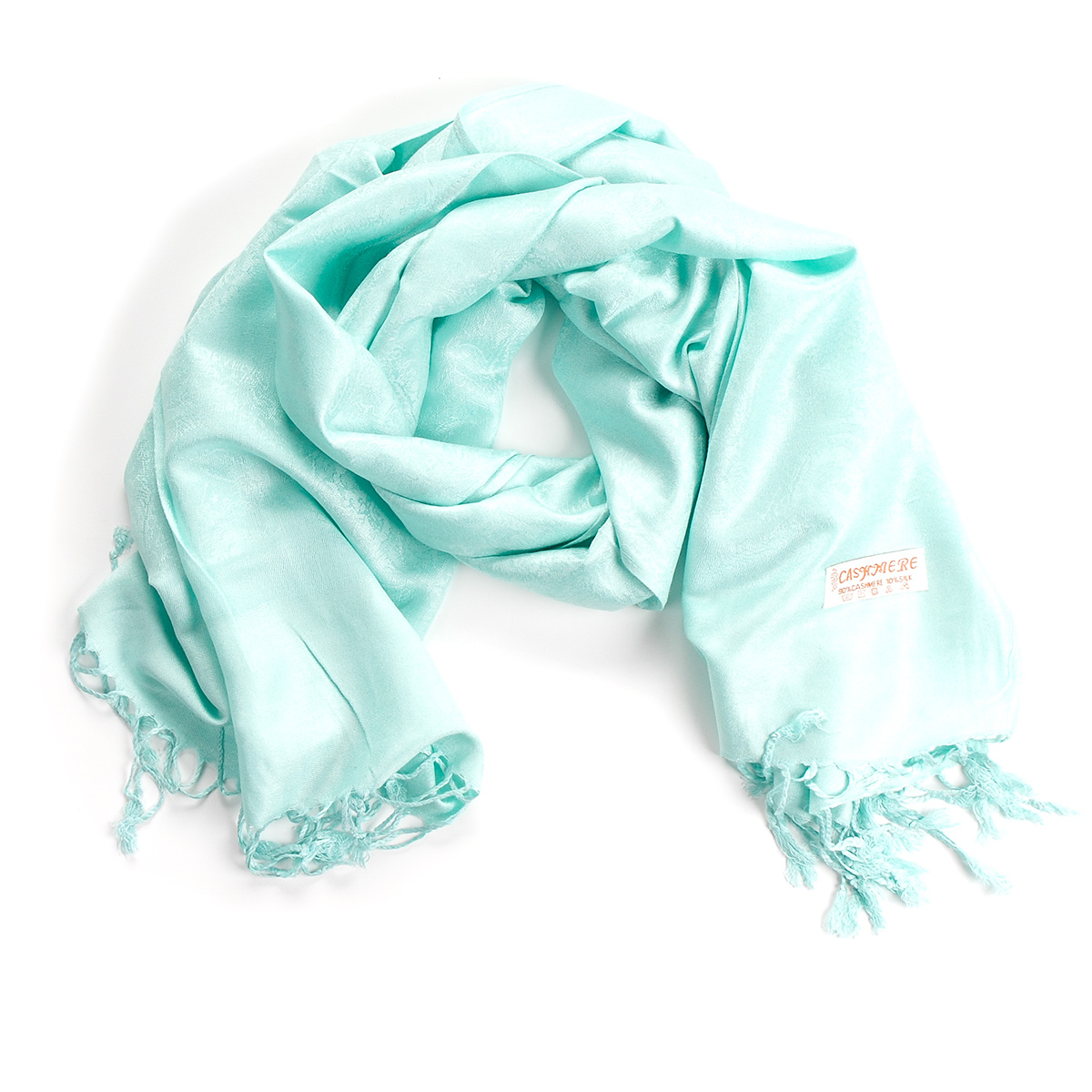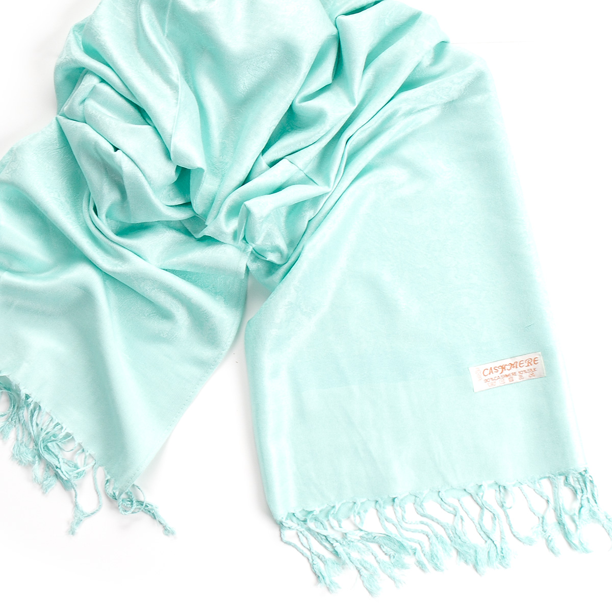 Elegantní teplá šála s třásněmi směs vlna kašmír s hedvábím a žakárovým paisley vzorem v pastel světle tyrkysové mint barvě. Śála je zakončena třásněmi, je měkka a hebká na omak, je velmi hřejivá a vzor je oboustranný.