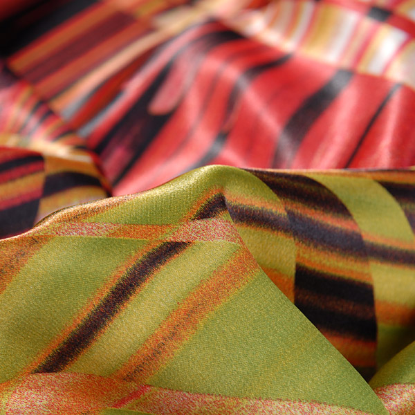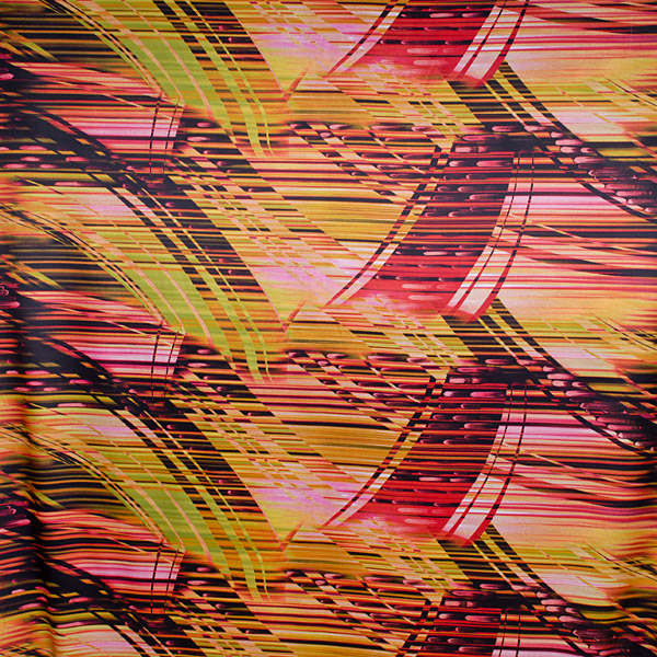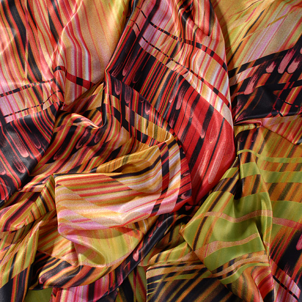 Efektní vzorový satén - látka s abstraktním vzorem jasných barvách převážně žluté, červené, černé a světle zelné. Vzor je digitálně tištěn na splývavou a pružnou látku.