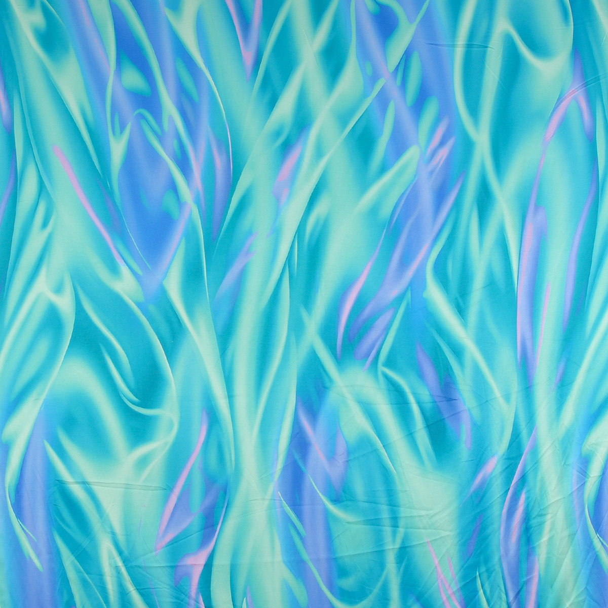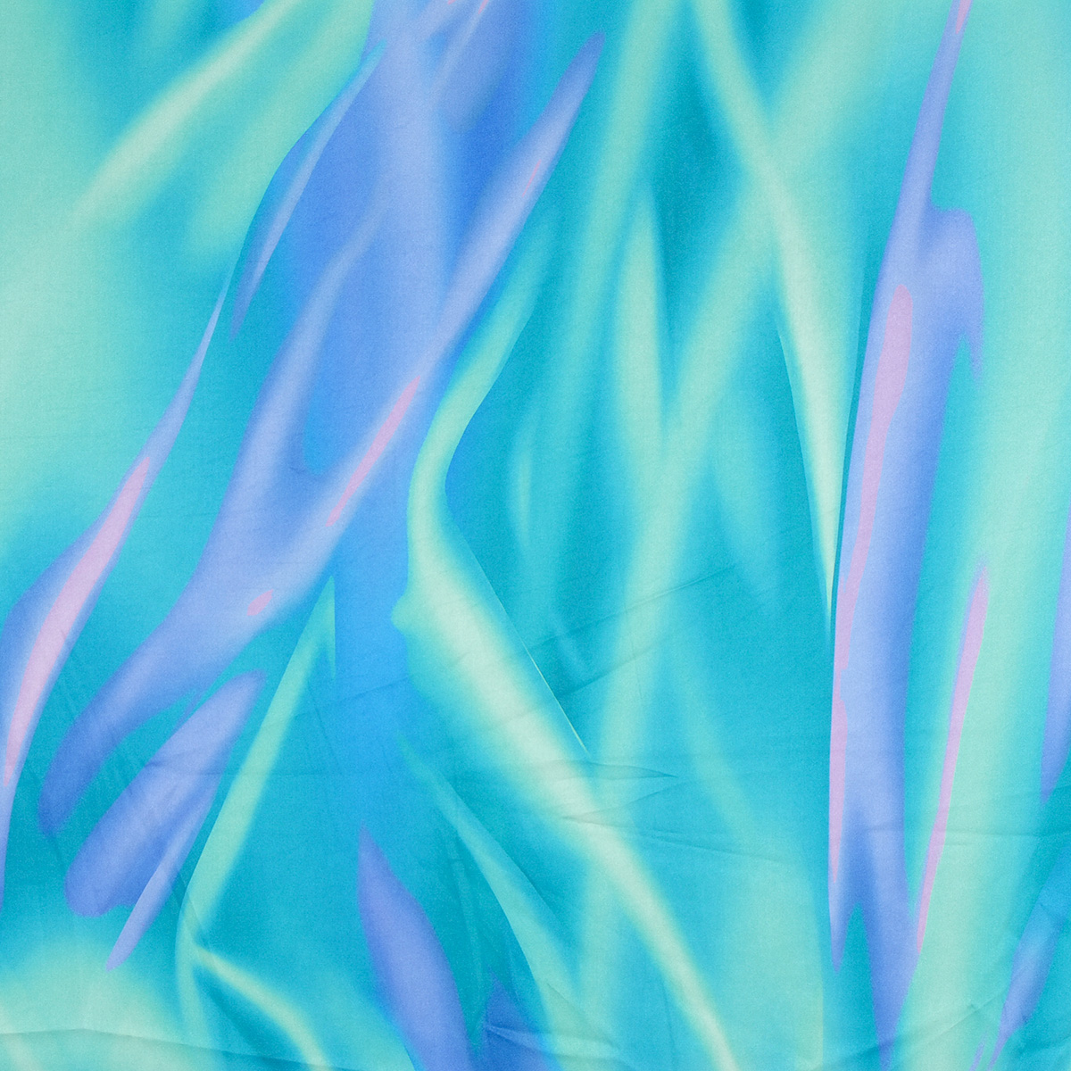 Jemný pružný satén imitace hedvábí s abstraktním vzorem v pastelových barvách tyrkysové, smaragdově zelené, fialové a modré. Látka má jen lehce lesklý povrch, spíše působí matněji oproti běžným saténům, je bohatě splývavá, je velmi příjemná na omak a není průsvitná.
