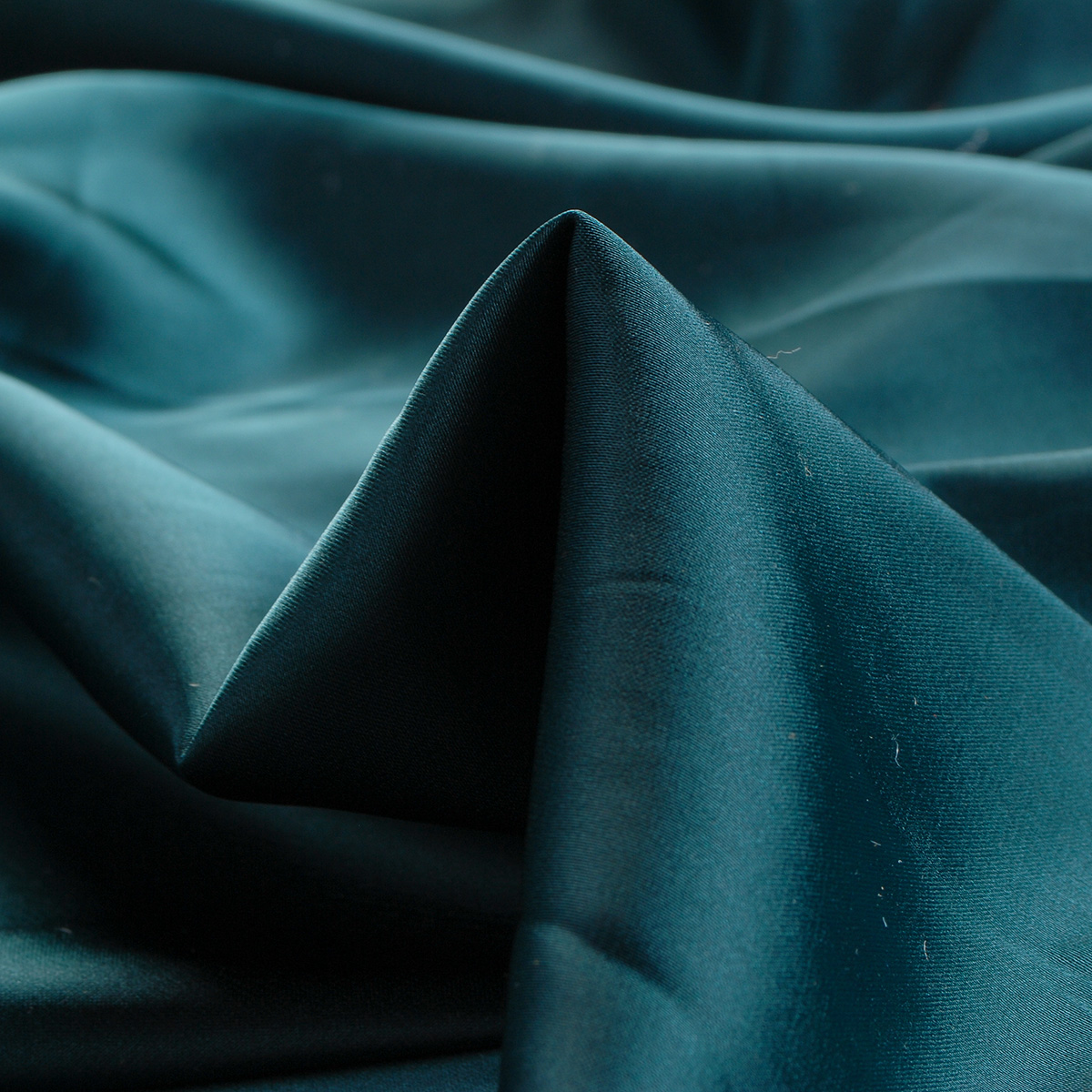 Satén matný jemný imitace hedvábí v tmavším odstínu petrolejové (tyrkysovo-zelené) barvy je luxusní látka v metráži. Tento materiál věrně připomíná přírodní hedvábí, má charakteristický saténový vzhled s elegantním matným povrchem. Látka je pružná, bohatě splývavá, velmi příjemná na dotek a neprůsvitná.