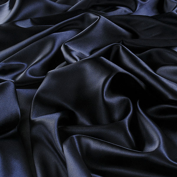 Pružný satén jemný v tmavě modré barvy. Saténová látka má charakteristický vzhled lesklého povrchu z líce a matného povrchu z rubové strany, látka je pružná, splývavá a neprůsvitná.