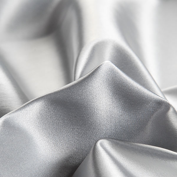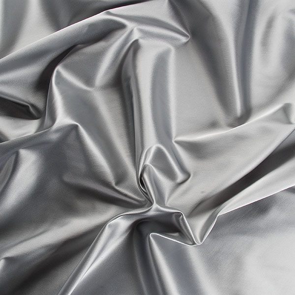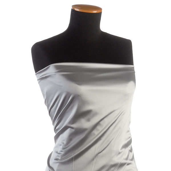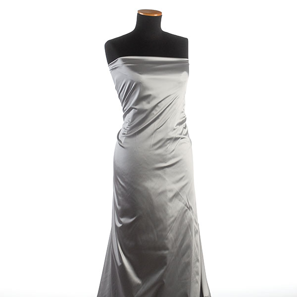 Látka pružný satén v barvě světle šedé s charakteristickým saténovým vzhledem lesklého povrchu. Satén je lehce pevnější, ale přitom i hezky splývavý, pružný a neprůsvitný, na šaty i sukně tedy není potřeba podšívky.
