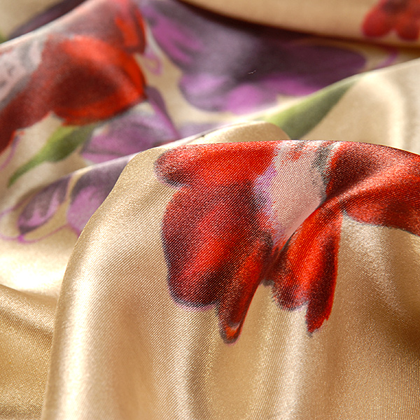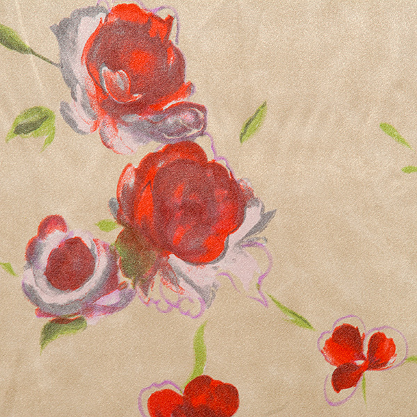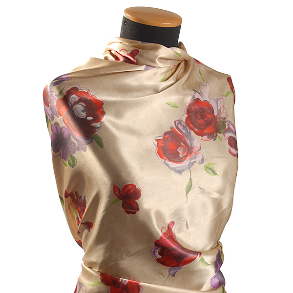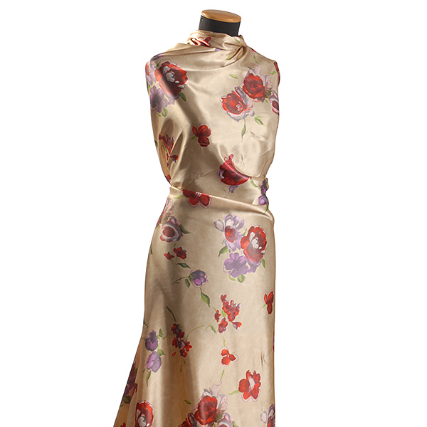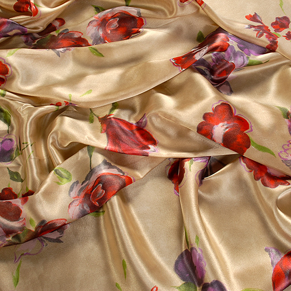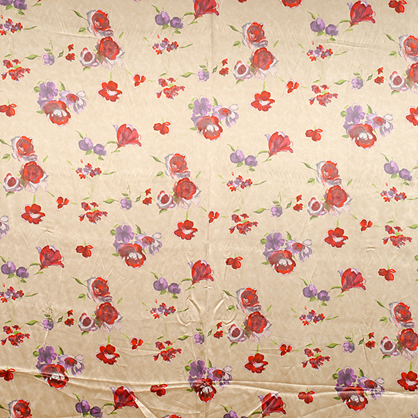 Satén vzor - látka se květinovým motive růží v barvách červené, fialové a starorůžové na krémovém podkladě. Vzor je digitálně tištěn na splývavou a nepružnou látku.