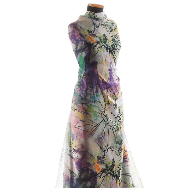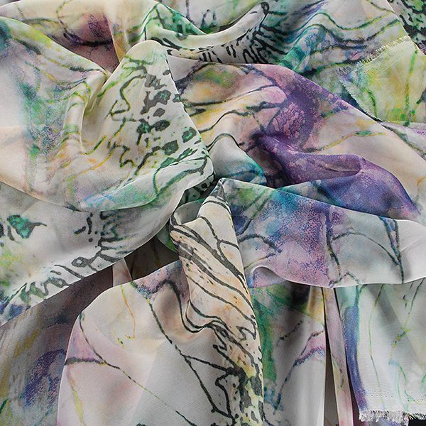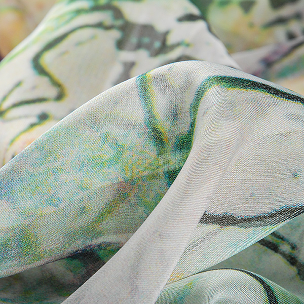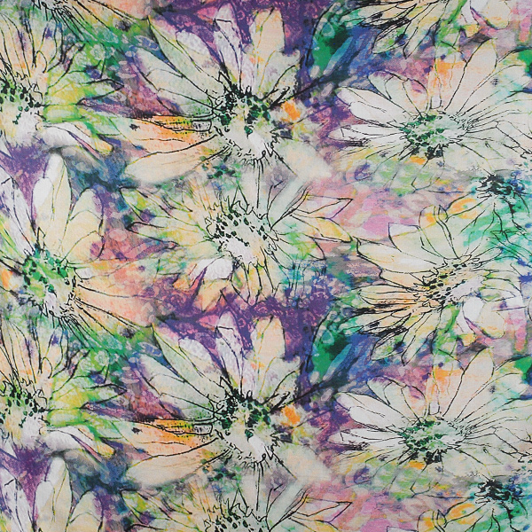 Šifon motiv velkých květů jemná látka s matným hladkým povrchem s motivem velkých květů v barvách zelenožluté a fialovorůžové. Šifon motiv velkých květů je jemná vzdušná a splývavá látka, s matným povrchem, příjemná na omak a pozor, je průsvitná, nutno použít podšívku.