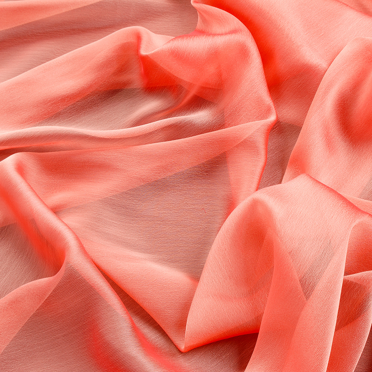 Jemná látkašifon šanžán imitující mušelínové hedvábí s lesklým povrchem v barvě oranžovočervené. Šifonová látka je vzdušná a splývavá, má lehce plastický povrch s plise úpravou.