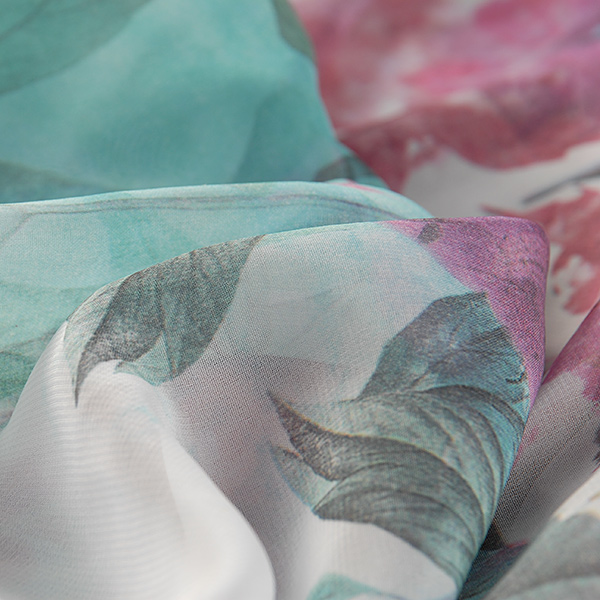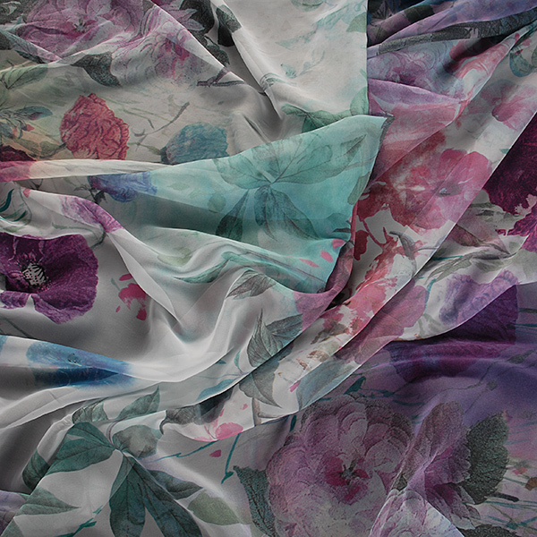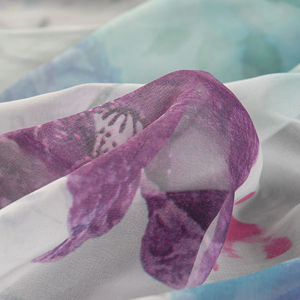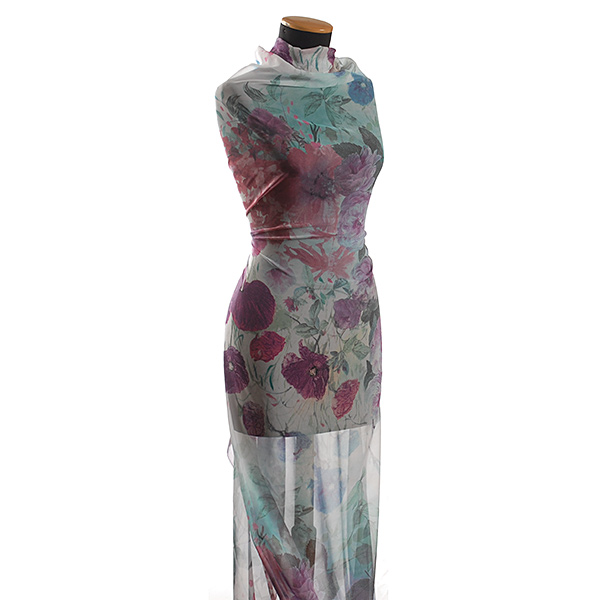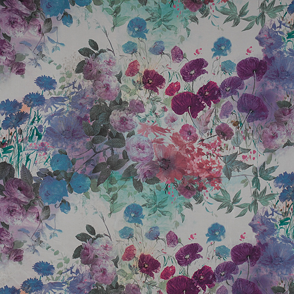 Efektní vzorový šifón - látka tisk květinový motiv louka v pastelových barvách růžové, vínové, fialové, zelené, modré a hnědé na podkladu svěle modré vše dokonale sladěno. Látka je vzdušná, splývavá a průsvitná.