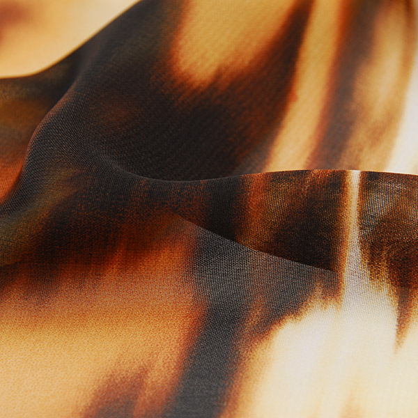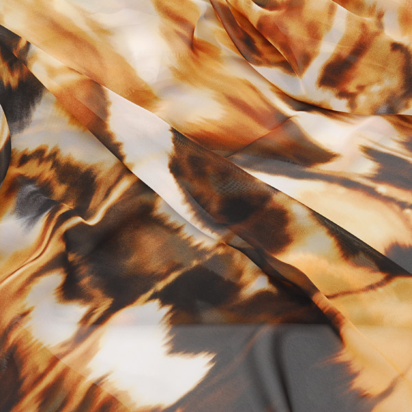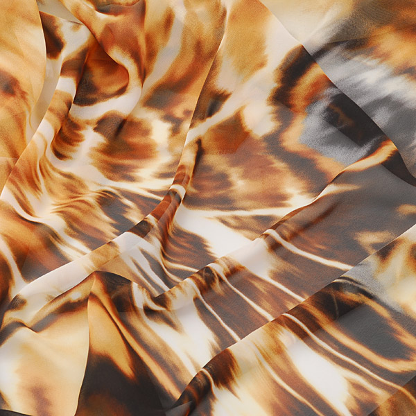 Efektní vzorový šifón - látkase vzorem křídla motýla v barevě hnědosmetanové fantazie. Vzor je digitálně tištěn na vzdušnou, splývavou a průsvitnou látku. Doporučujeme na šaty a sukně použít podšívku.