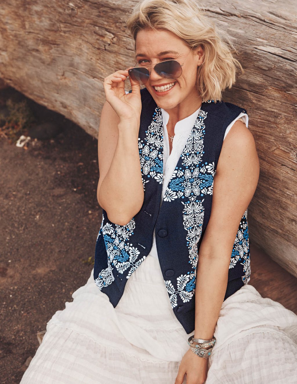 Pokud se vám kabátek zdá být do horkých letních dní přecijen stále příliš teplý, můžete si s velmi podobným střihem (nechat) ušít i vestičku. Tato má upravený výstřih do tvaru "V". Opět je potřeba zvolit nesplývavý materiál jako u předchozího modelu – ideálně také len, ale můžete použít třeba i riflovou látku (denim).