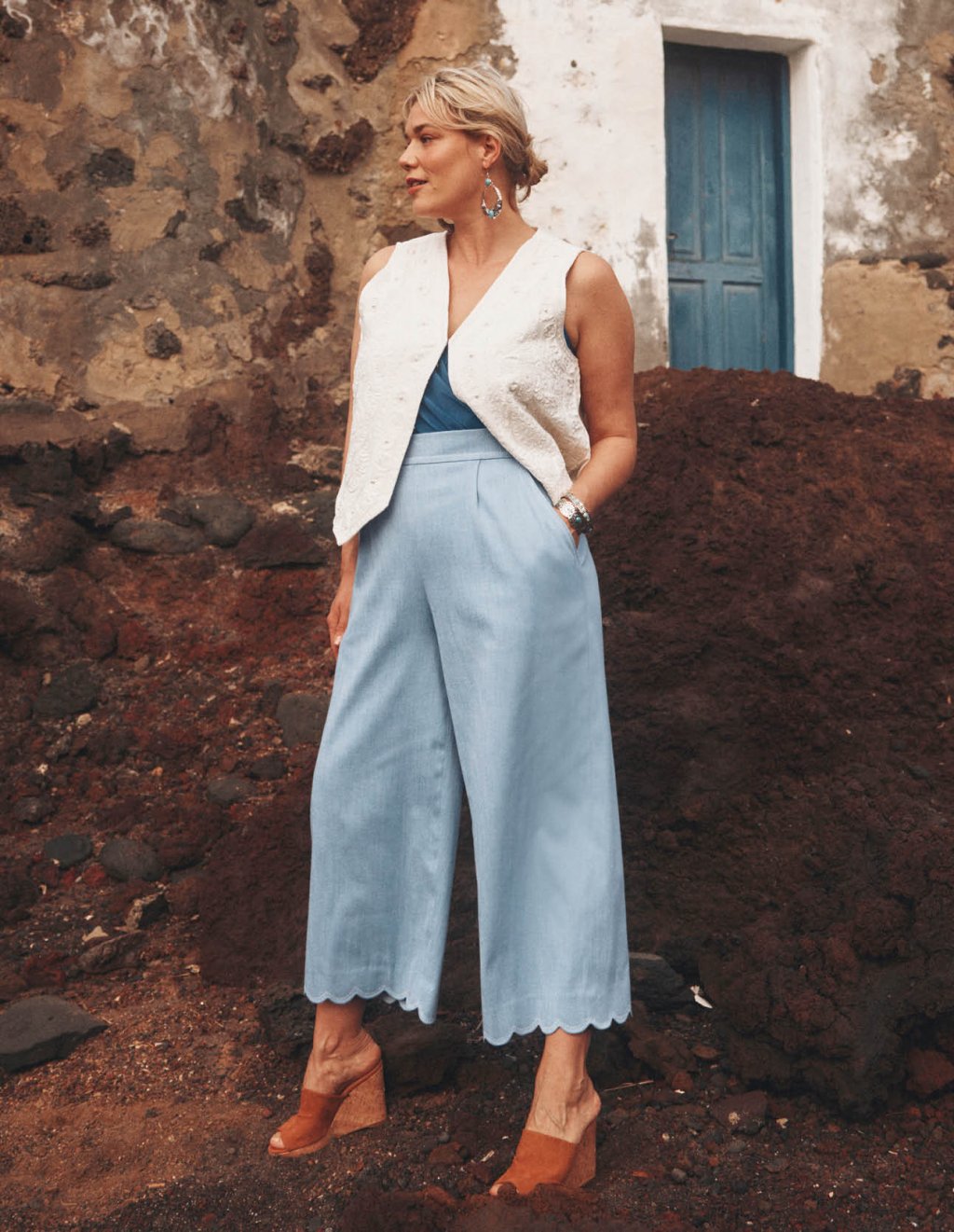 Když máte na cestovaní raději pohodlí kalhot, můžete si ušít tyto vzdušné široké kalhoty – např. z nějakého jemného denimu. Pokud chcete mít jistotou, že vám nebude příliš teplo a denim by se vám zdál být moc silný, můžete použít i jemnou kostýmovku se vzhledem lnu. Krom toho, že je nemačkavá a na takovéto volné kalhoty mimořádně vhodná, se z ní také dobře šije (a máme ji i v růžové).