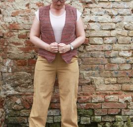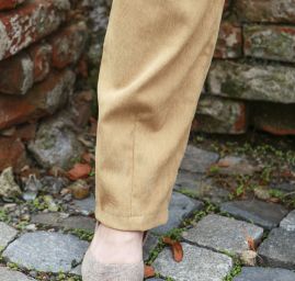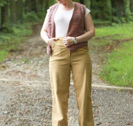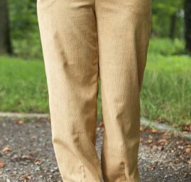 Celkově jsem se inspirovala modelem č. 116 ze strany č. 29 a ke kalhotám jsem si ušila rovnou i vestičku. Pro kalhoty jsme s paní Lenkou z MarLen zvolily pružný manšestr s úzkými proužky v pískové barvě. Tento manšestr se šije velmi dobře, ale při žehlení je třeba dávat pozor a mít žehličku nastavenou spíše na menší teplotu, aby se vám nespálila spandexová vlákna. Látka by se vám mohla zvlnit a vytahat. Určitě je lepší na zkoušku přežehlit nejdříve odstřižek, než se pustíte do žehlení hotového modelu.
