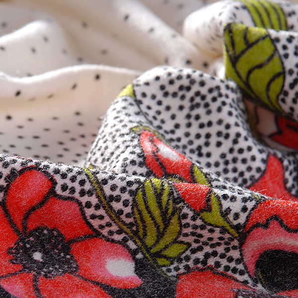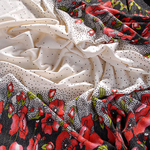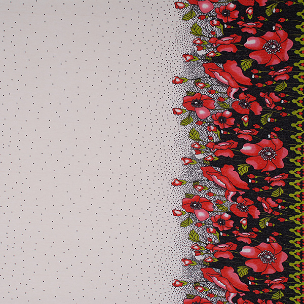 Středně silný úplet romantický tisk vlčí máky na smetanovém podkladu. Látka je pružná, hřejivá a splývavá.