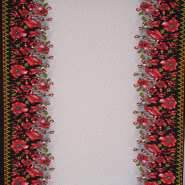 Vzor je po délce látky, vlčí máky tvoří borduru z obou stran látky a jsou cca 50 cm vysoké.