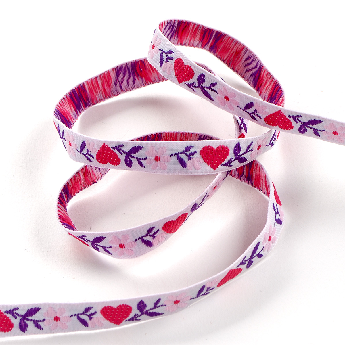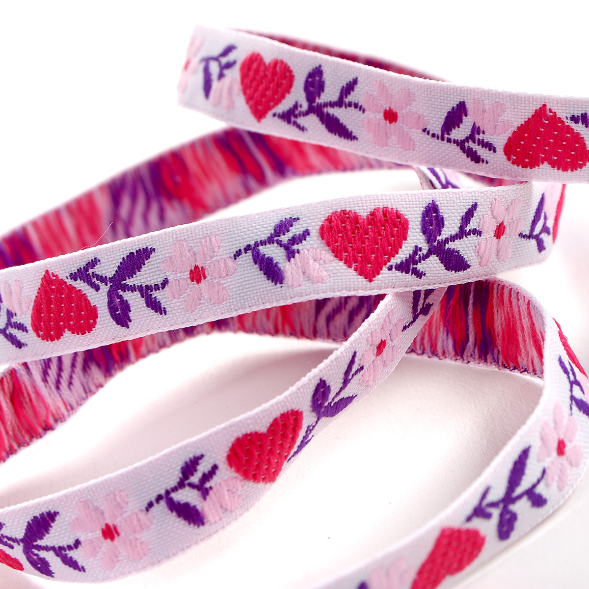 Stuha krojová vyšívaná bílá/růžová 9mm - výšívaná stuha s folklórním vzorem květin a srdíček v barvách růžové a modré na bílém podkladě. Stuha krojová vyšívaná bílá/růžová 9mm neboli textilní porty borty jsou vhodné na dozdobení nejen krojového oděvu.