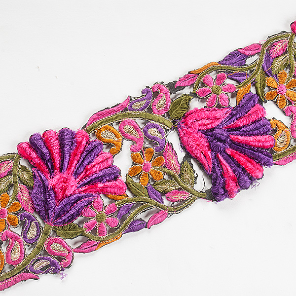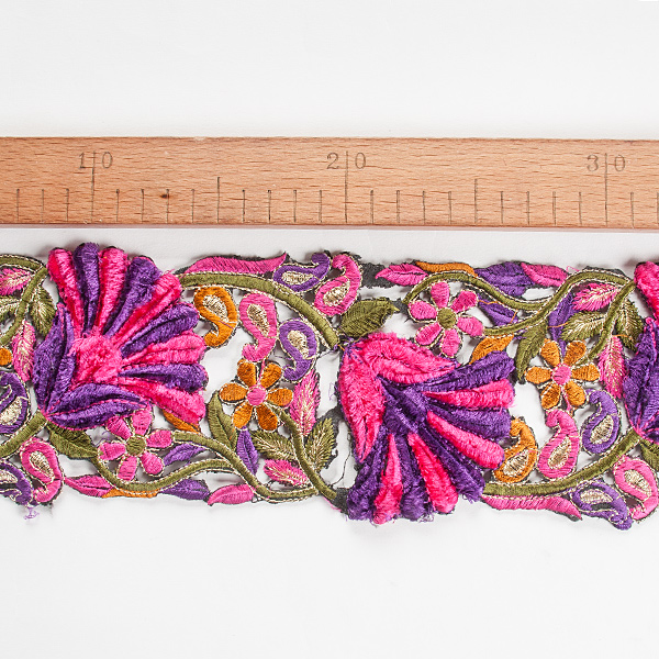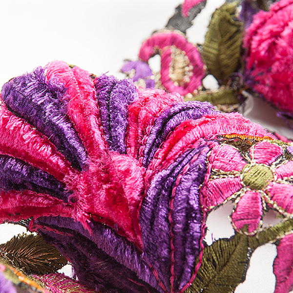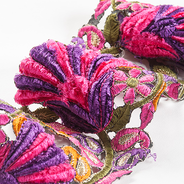 Stuha porta vzdušná výšivka s motivem květů a lístků v růžových, fialových, zelených a žlutých barvách, doplněna zlatou lurexovou nití.