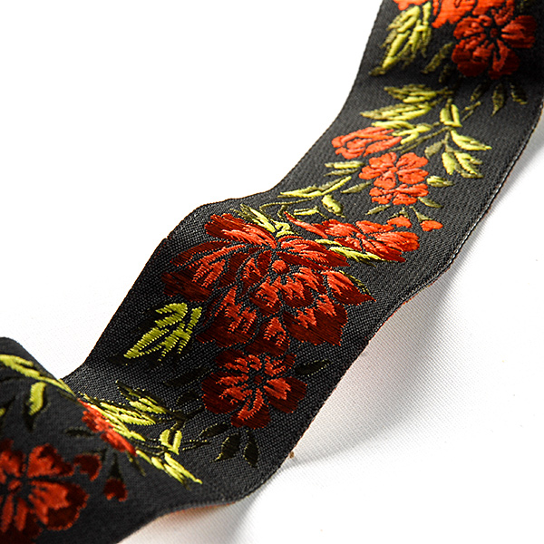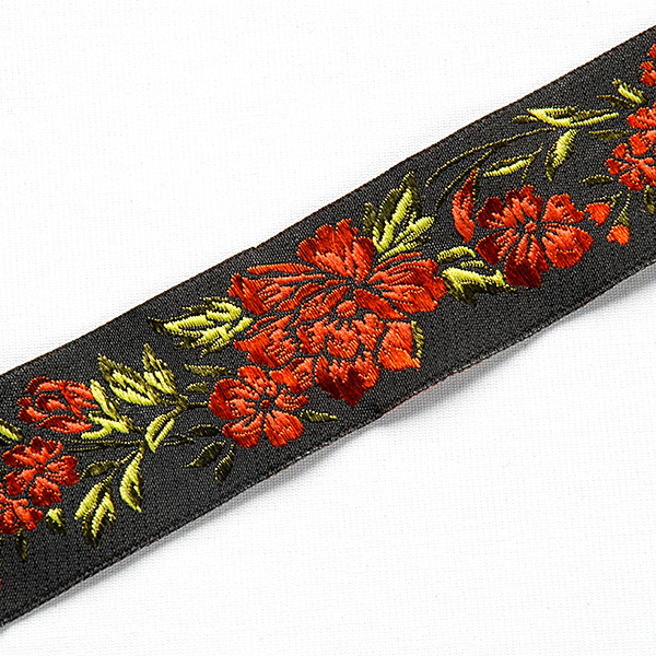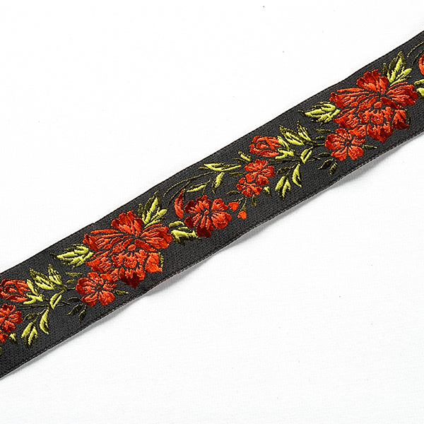Stuha textilní vyšívaná taftová vyšívaná stuha s květinovým motivem v barvách oranžové a zelené na černém podkladě. Stuha je vhodná na dozdobení oděvu, dobového kostýmu či aplikaci na tašky, klobouky a podobně.