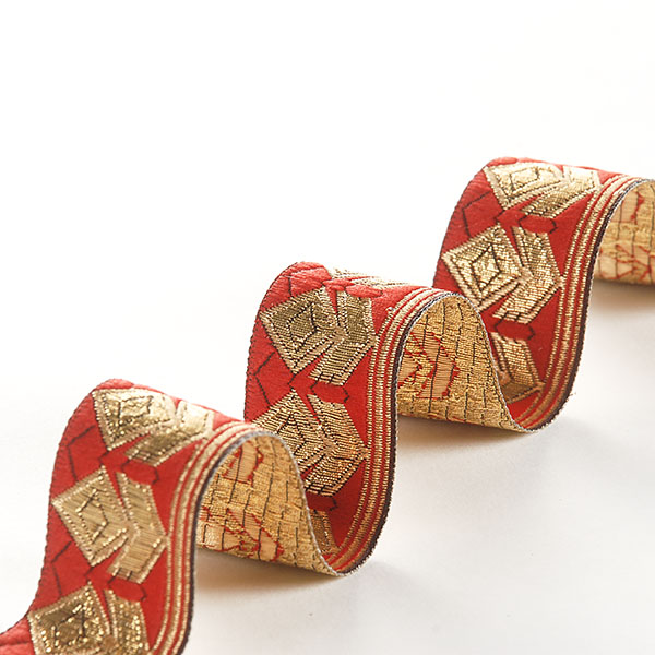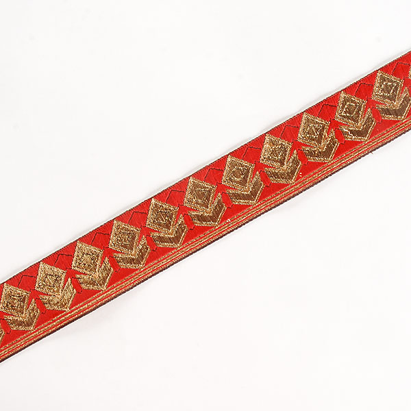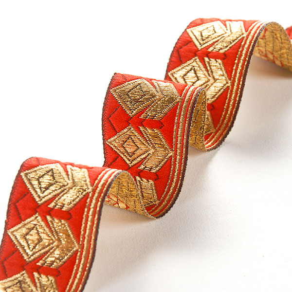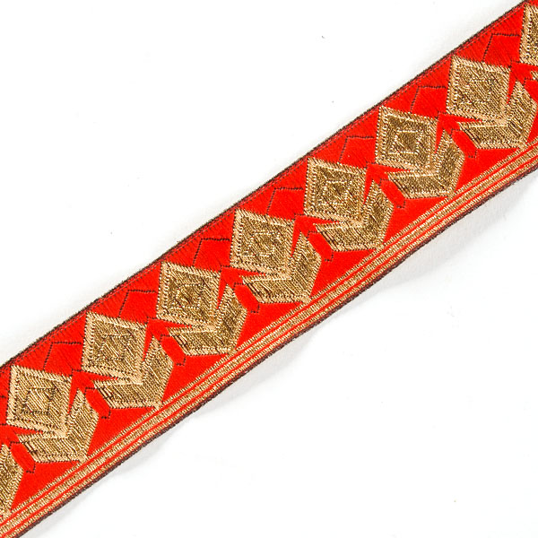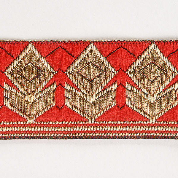 Stuha žakárová geometrický vzor červená s kovovým vláknem zlaté barvy s výšivkou zlatých geometrických tvarů.Stuha žakárová geometrický vzor červenáStuha červené barvy se zlatým geometrickým vzorem, je vhodná na dozdobení oděvu, dobového kostýmu či aplikaci na tašky, klobouky a podobně.