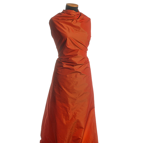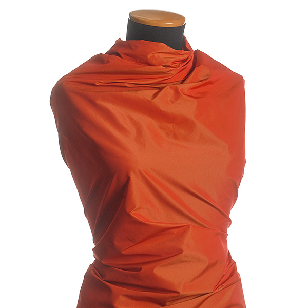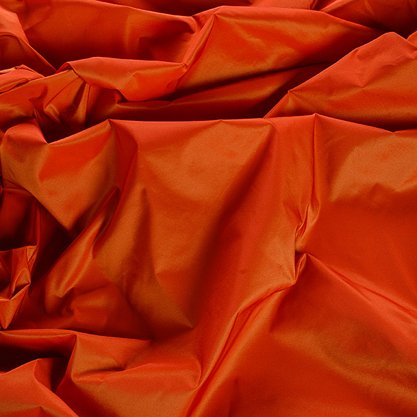 Taft šanžán žlutočervený - látka šanžánový taft v barvě žlutočervené. Látka má svůj charakteristický ostrý omak, má lehce lesklý povrch a elegantní vzhled.Taft šanžán žlutočervený
