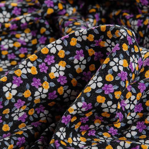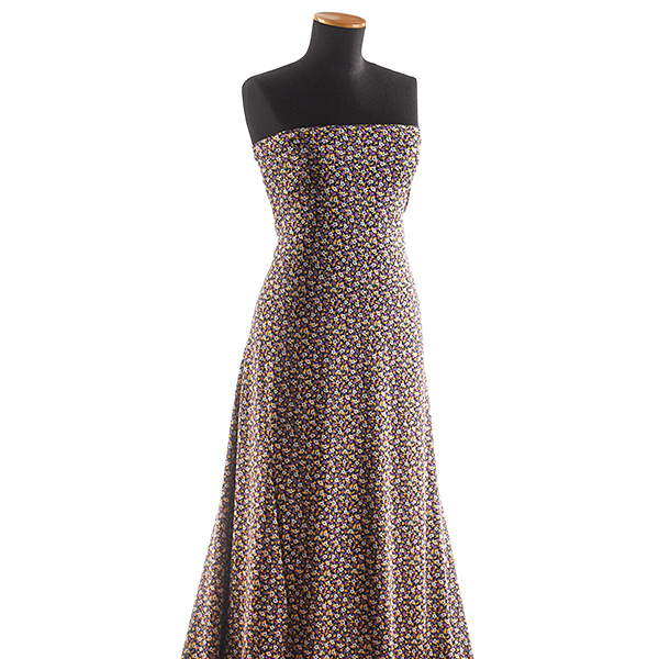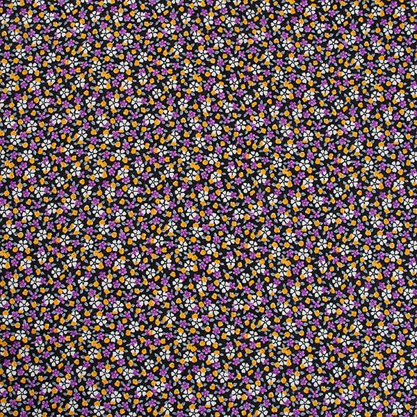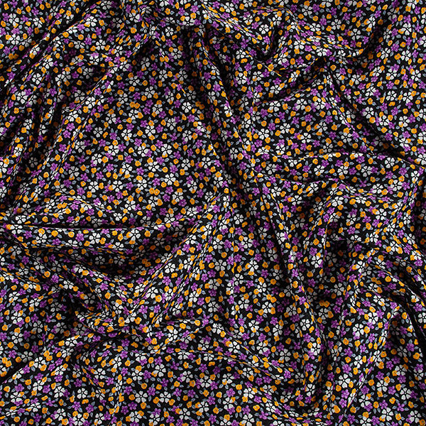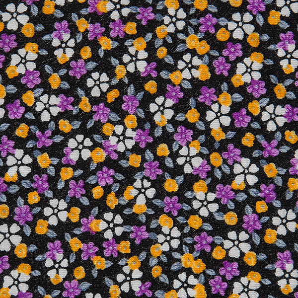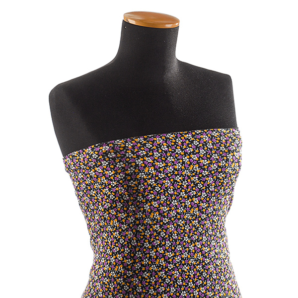 Úplet - jemný viskozový úplet s motivem drobných květin v barvách fialové, bílé, žluté a šedé na černém podkladě. Úplet pletenina je pružná látka s matným povrchem, je splývavá a příjemná na omak.