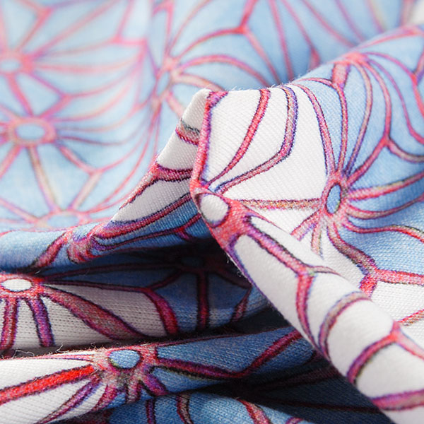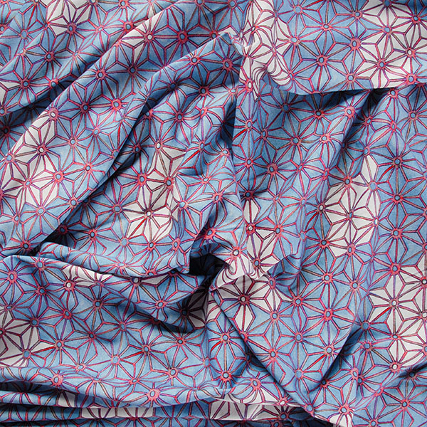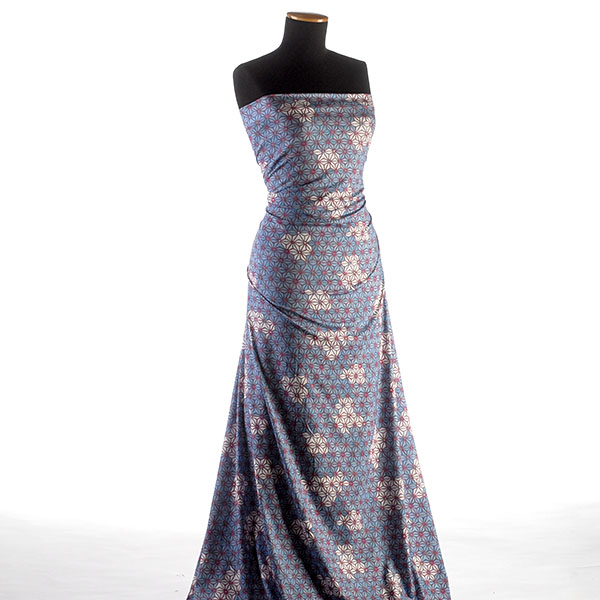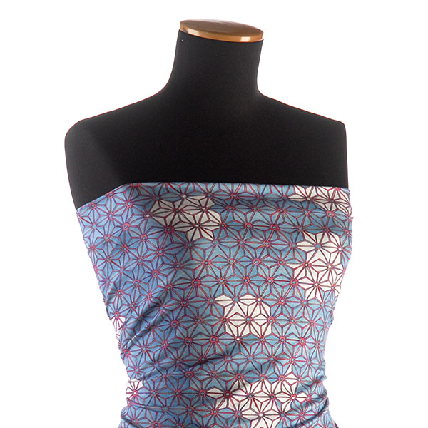Úplet viskozvoý geometrický vzor- jemná úpletová látka s matným povrchem s geometrickým vzorem hvězdiček v barvách pastel modr, růžové a smetanové. Úplet viskozvoý geometrický vzor je pružná látka v obou směrech, je splývá a příjemná na omak, není průsvitná.