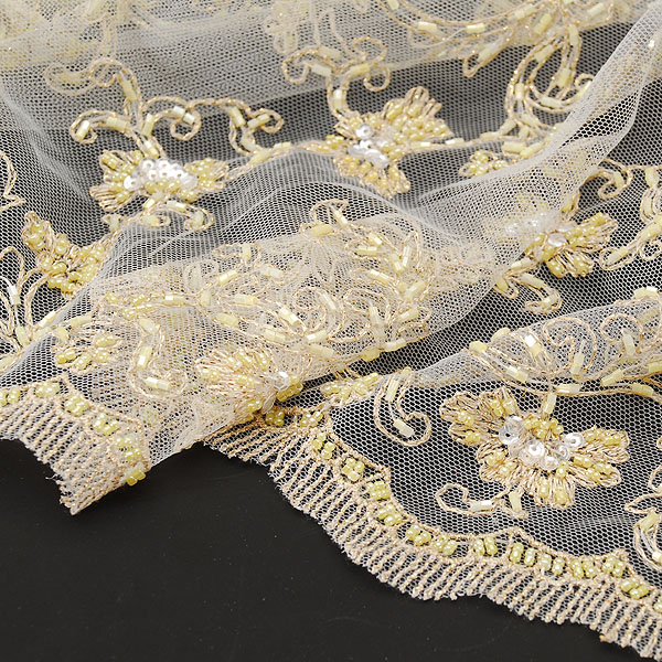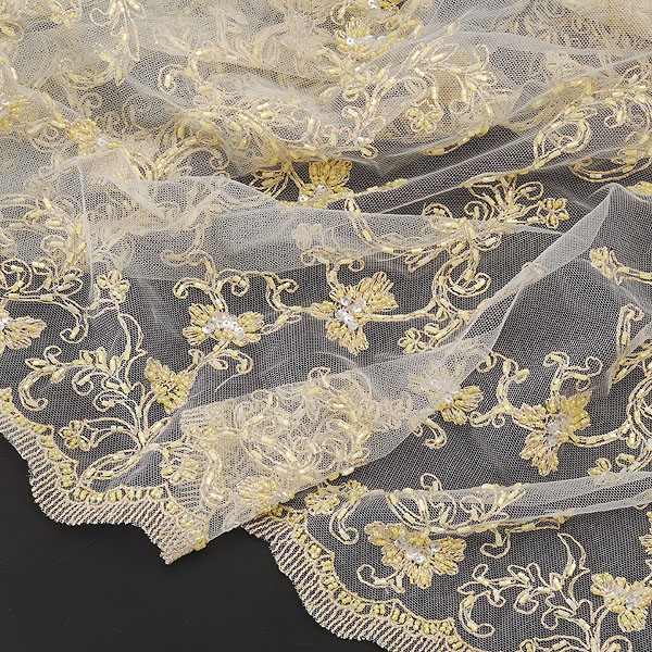 Efektní krajka na tylu se zlatavou výšivkou, pošita korálkami a flitrami. Oba kraje sjou zdobné, šíře 138 cm