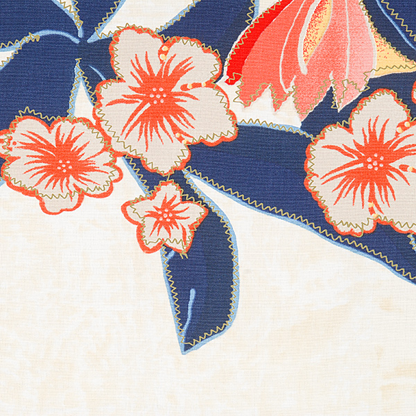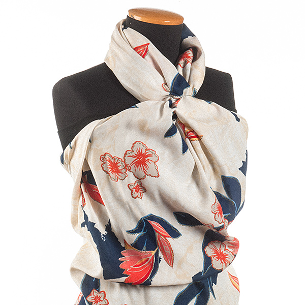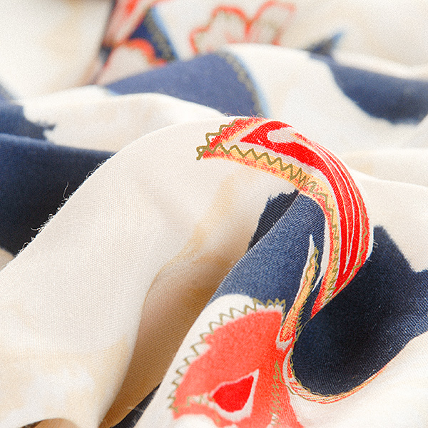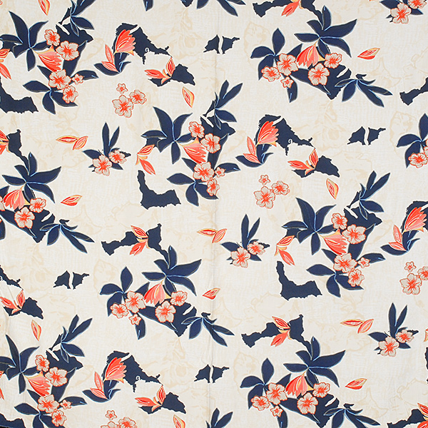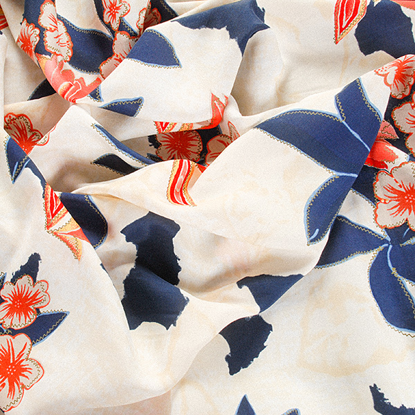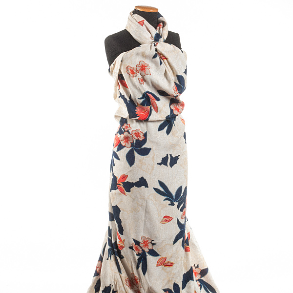 Viskoza směs letní látka - jemná viskozová látka květinový motiv v modrých, červených a oranžových barvách na smetanovém podkladě. Látka má jemný matný povrch, je splývavá a lehce pružná svou vazbou.