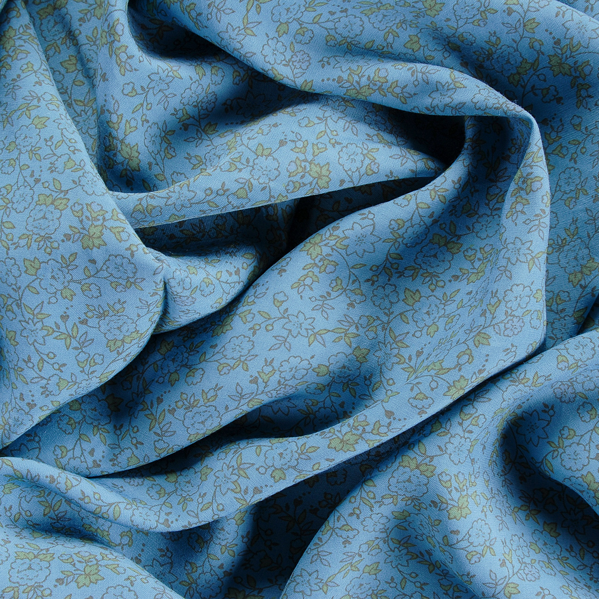 Viskozová letní látka kytičkový motiv modro/žlutá - vzdušná letní látka na šaty s romatnickým vzorem drobných květů žlutohnědé barvy na modrém podkladě. Viskozová letní látka kytičkový motiv modro/žlutá - je jemná, splývavá, pružná látka, není průsvitná, nepotřebujete tedy podšívku, má matný povrch a je velmi příjemná na omak.