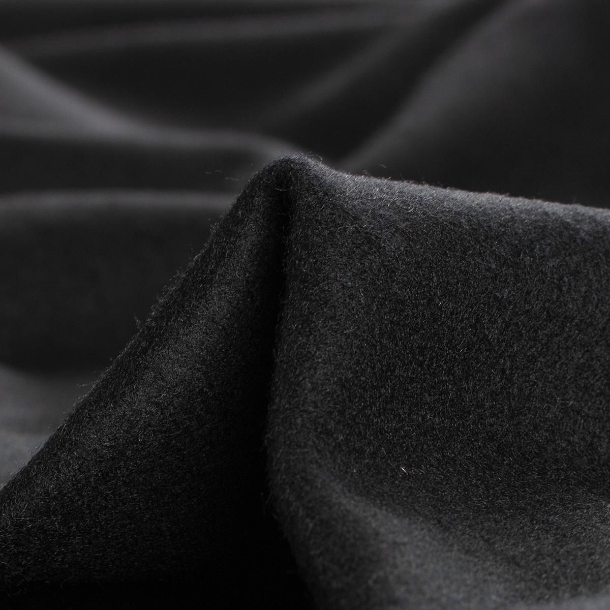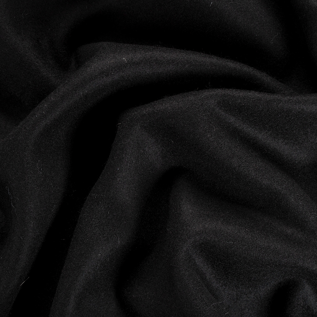 Hřejivá zimní vlněná látka černé barvy s jemným vlasem vhodná na kabát či teplé sako. Látka je pevnější, na omak ale působí jemně.