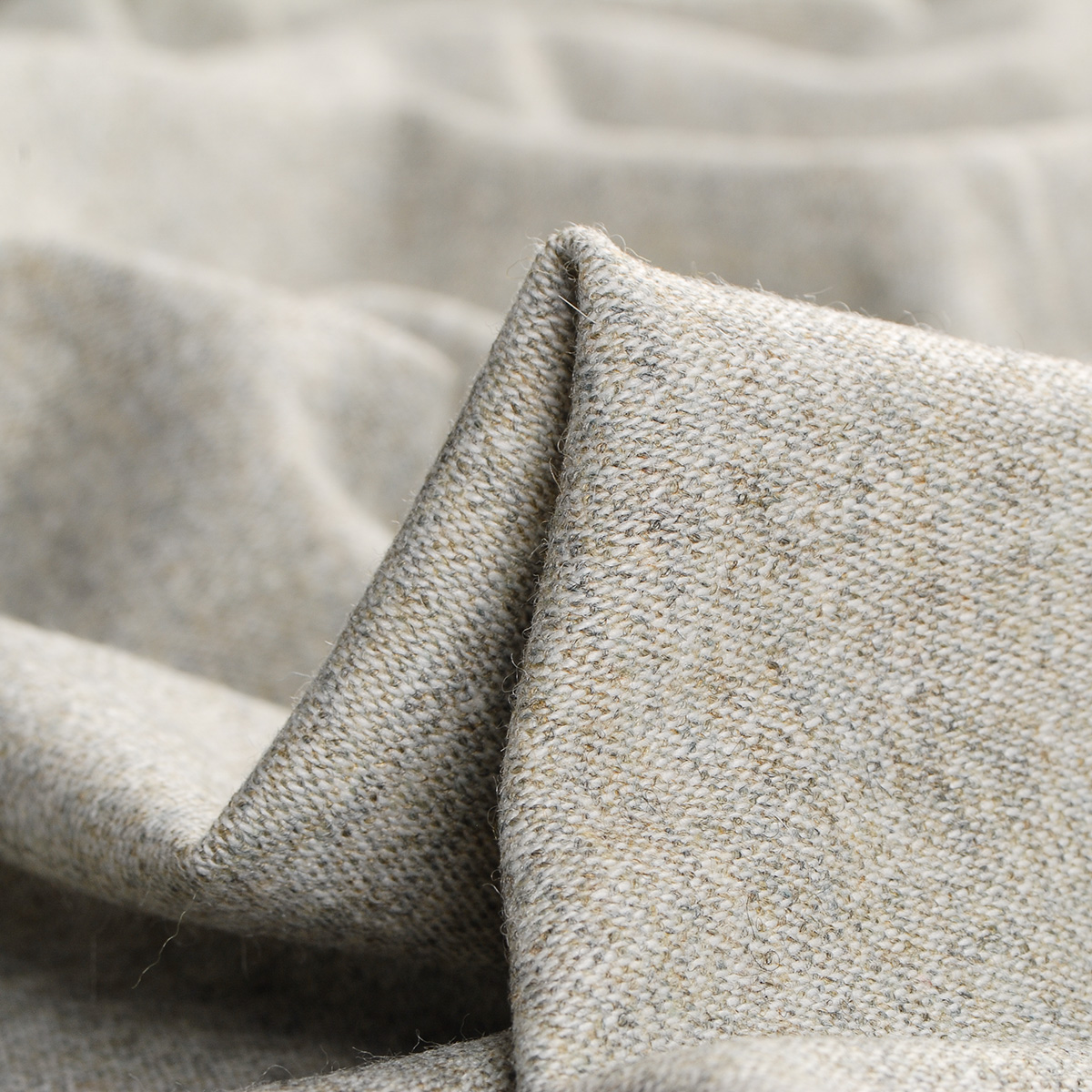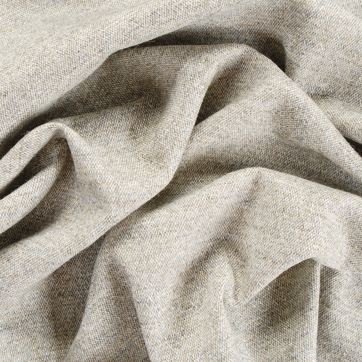 Kostýmová vlněná látka v barvě zelenokrémového melíru s jemným vlasem. Látka je střední síly, je dosti pružná do šířky, má lehce drsný omak po příměsy vlny (pro citlivé může být kousavější), je poddajná a lehce splývavá.