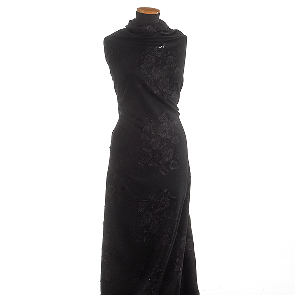 Kostýmová směsová vlněná látka doplněna krajkovou květinovu aplikací s flitry v černé barvě. Látka je středně silná, lehce pružná svou vazbou vhodná na kostým, ale i teplejší tubové šaty.