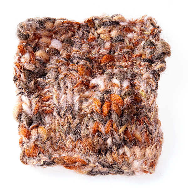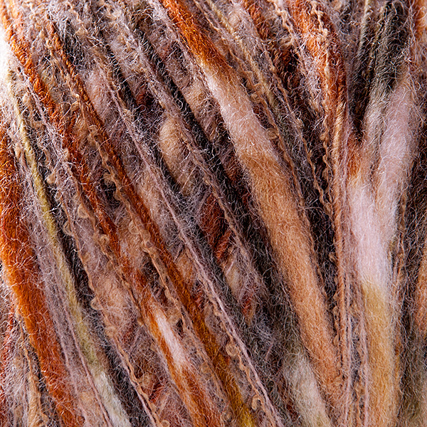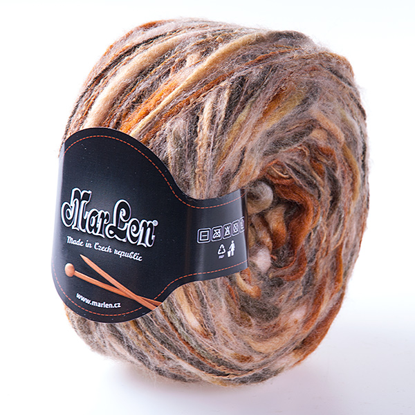 Efektní vlněná pletací příze nestejné síly v barvě hnědorezavého melíru s vlnkovu buklé přízí. Pletací přízi můžete použít i jako efektní příplet do svetru nebo na čepici či šálu. Pletací příze bude v pletenině tvořit nepravidelný melír s plastickou strukturou nestejné síly - není třeba volit složité vzory, vynikne na hladkém jednoduchém vzoru.