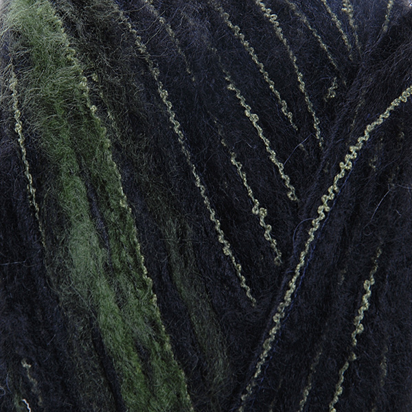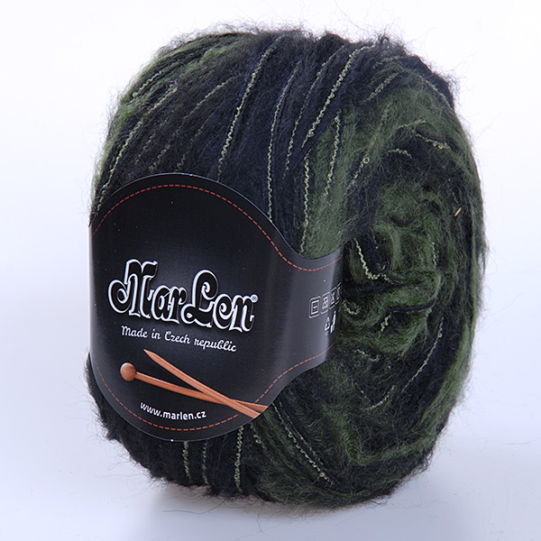 Efektní vlněná pletací příze v barvě zelenočerného melíru s efektní mohérovou přízí nestejné síly. Lze použít i jako efektní příplet do svetru nebo na čepici či šálu, je jemná a nekousavá. Pletací příze bude v pletenině tvořit nepravidelný melír.