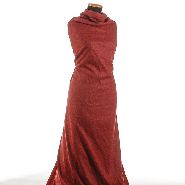 Vlněný úplet pletenina - středně silná pletenina s příměsí lamí vlny s jemným vlasem v hnědovínové barvě. Metráž je pružná, lehce plastické struktury a je vhodná na teplejší šaty, sukně, ale i elegantní sáčko (nutno podlepit).