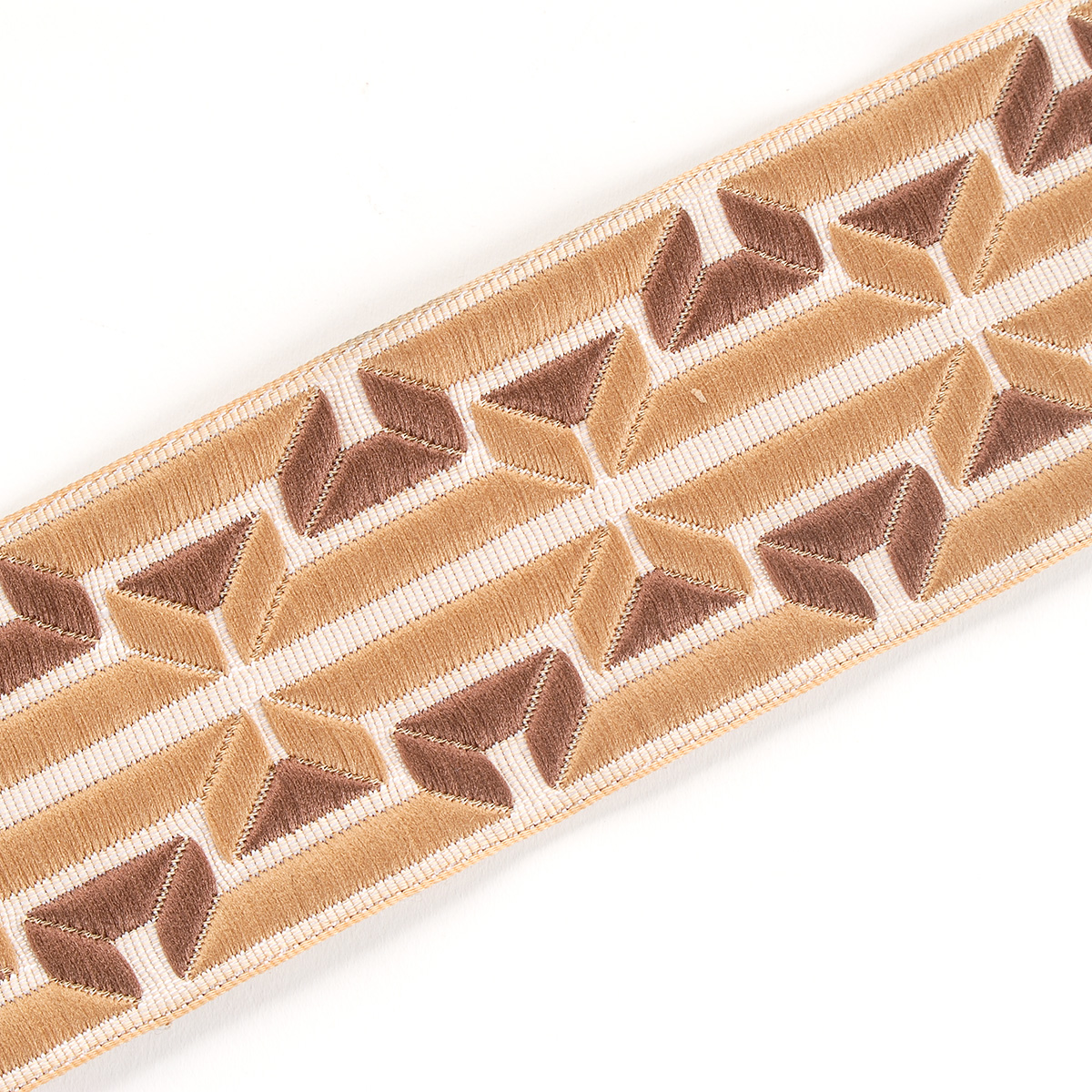 Elegantní vyšívaná stuha s geometrickým vzorem v barvách světle a tmavě hnědé barvy na béžovém podkladu. Stuha s výšivkou neboli textilní porta je vhodná na dozdobení oděvu. Oceníte je určitě při šití nevšedních svatebních šatů, renesančního historického dobového kostýmu nebo zdobení tašky, klobouku a podobně.