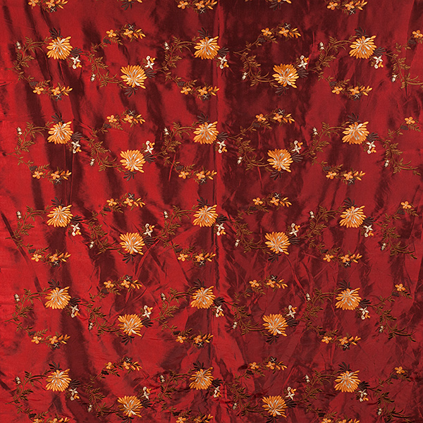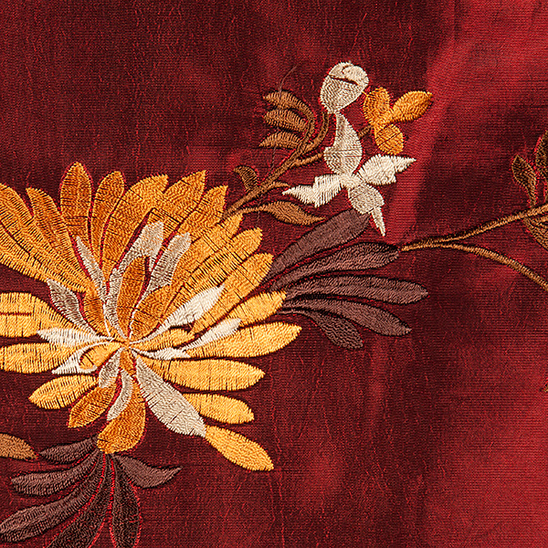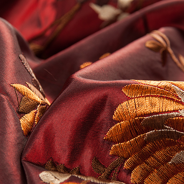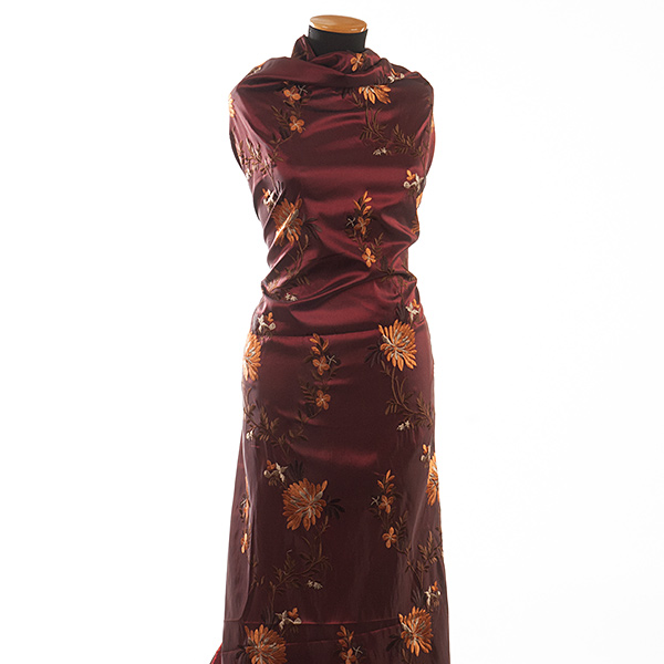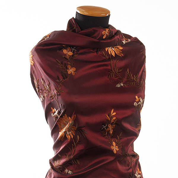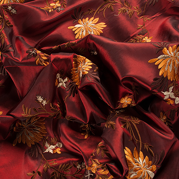 Efetkní taftová vyšívaná látka v barvě šanžán vínové s motivem květů. Metráž má chyrakteristický ostrý omak, má lehce lesklý povrch a elegantní vzhled. Nemačká se, je mírně splývavá a drží tvar.