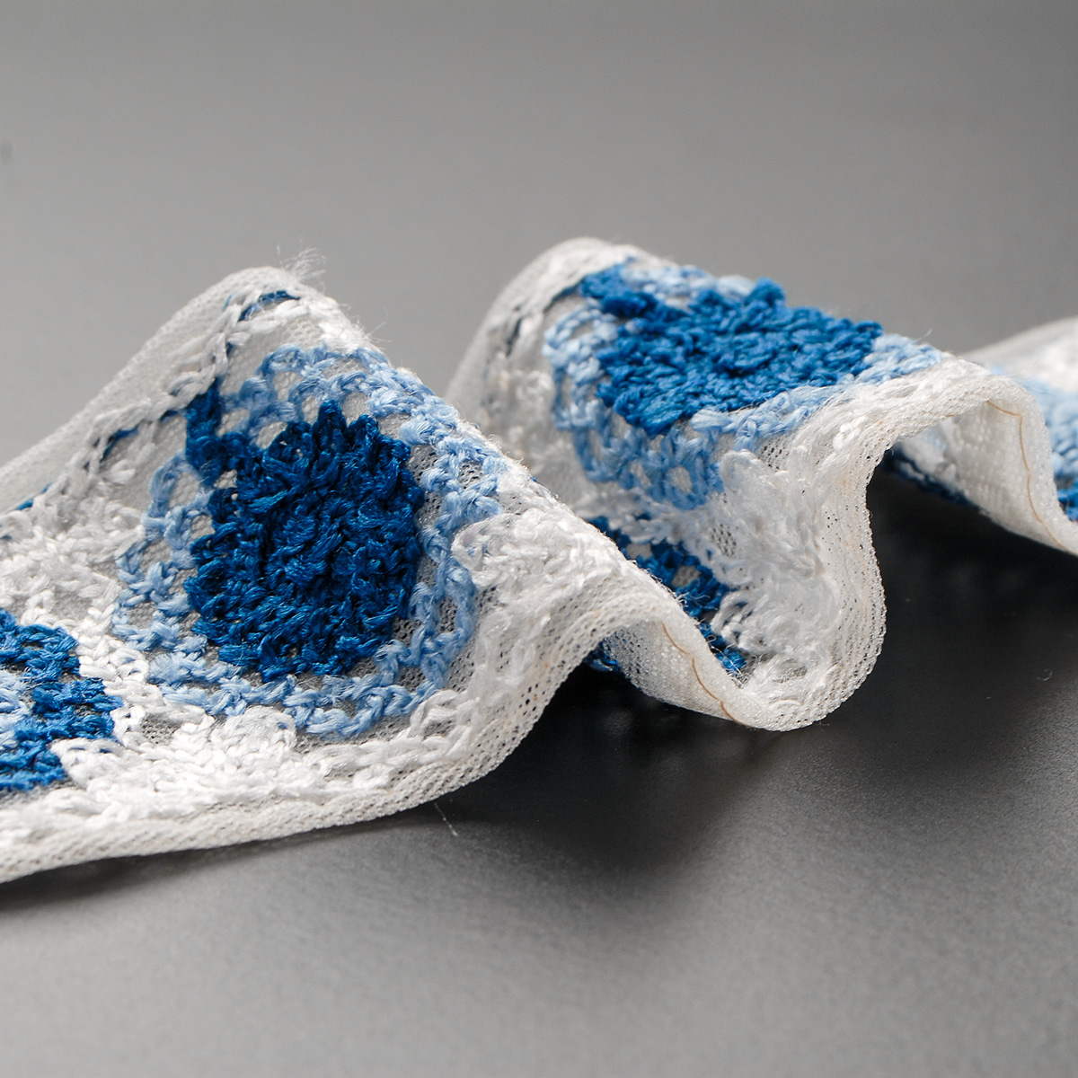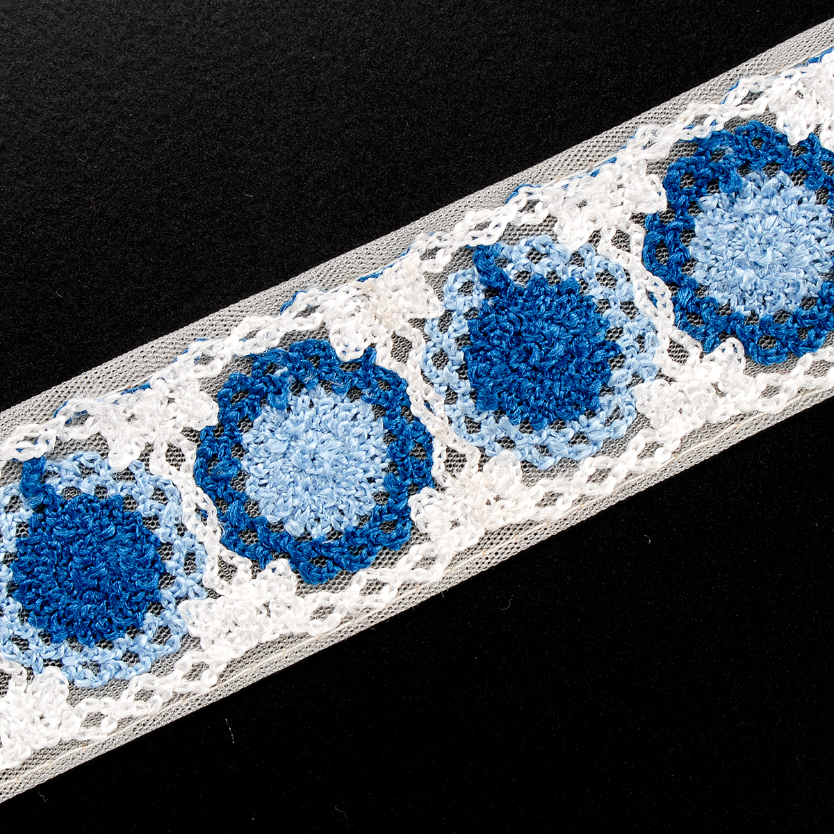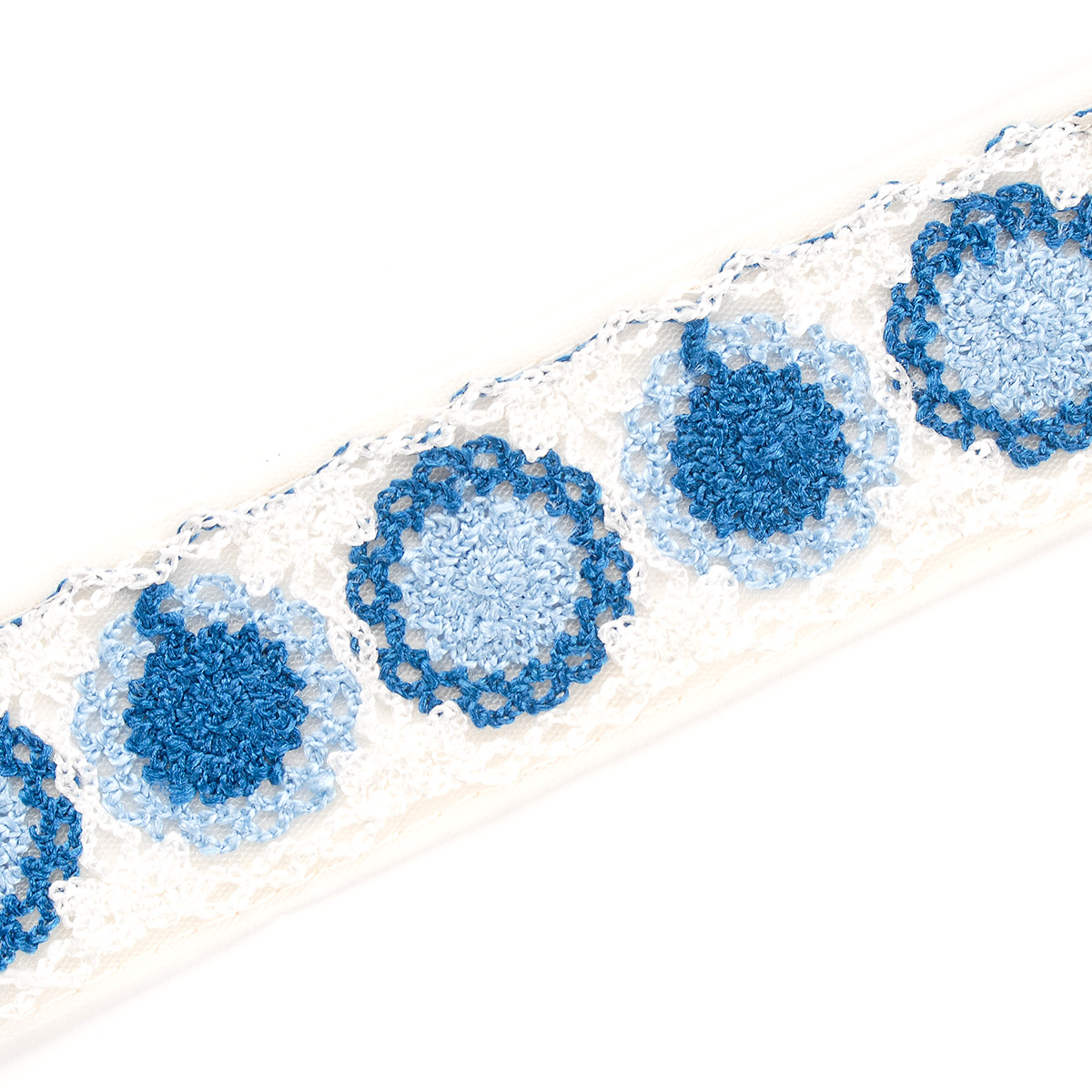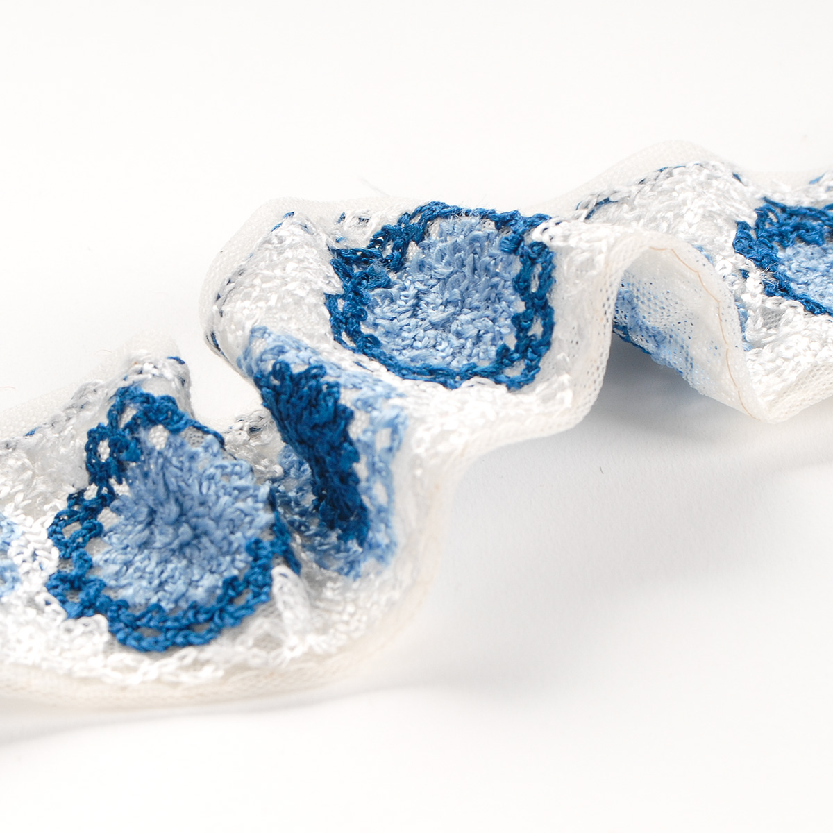 Elegantní vyšívaná stuha s kulatým květinovým vzorem v barvách světlé a tmavé modré barvy na tylu lomení bílé barvy. Stuha s výšivkou neboli textilní porta je vhodná na dozdobení oděvu. Oceníte je určitě při šití nevšedních svatebních šatů, renesančního historického dobového kostýmu nebo zdobení tašky, klobouku a podobně.