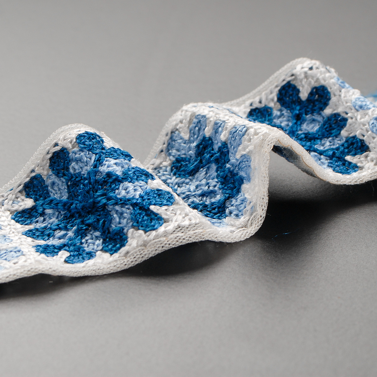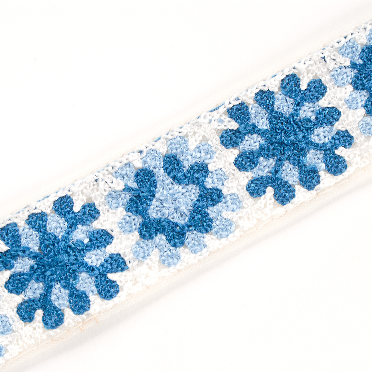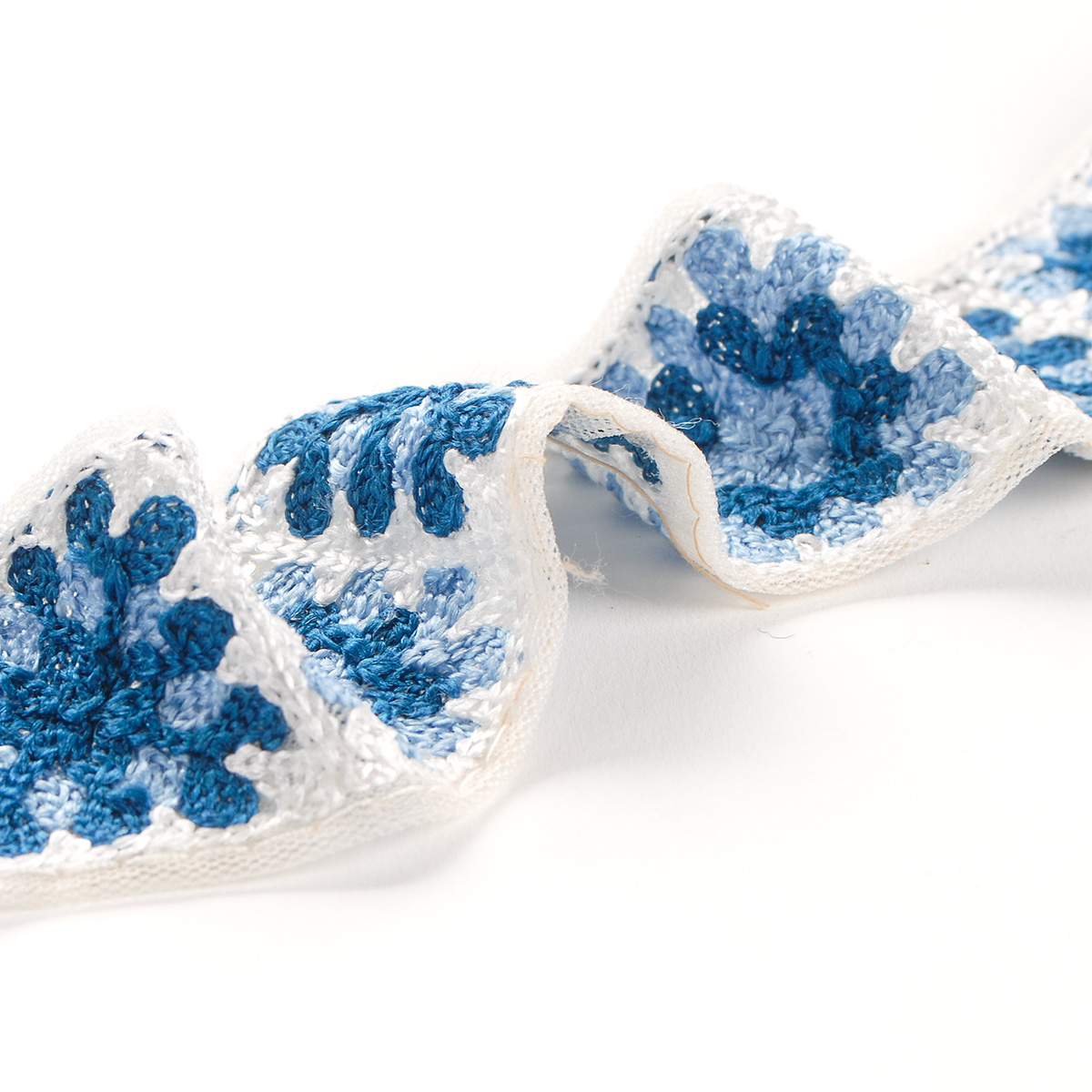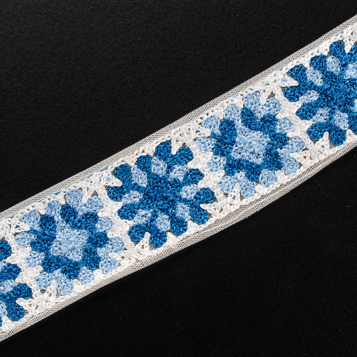 Elegantní vyšívaná stuha s hranatým květinovým vzorem v barvách světlé a tmavé modré barvy na jemném tylu lomené bílé barvy. Stuha s výšivkou neboli textilní porta je vhodná na dozdobení oděvu. Oceníte je určitě při šití nevšedních svatebních šatů, renesančního historického dobového kostýmu nebo zdobení tašky, klobouku a podobně.