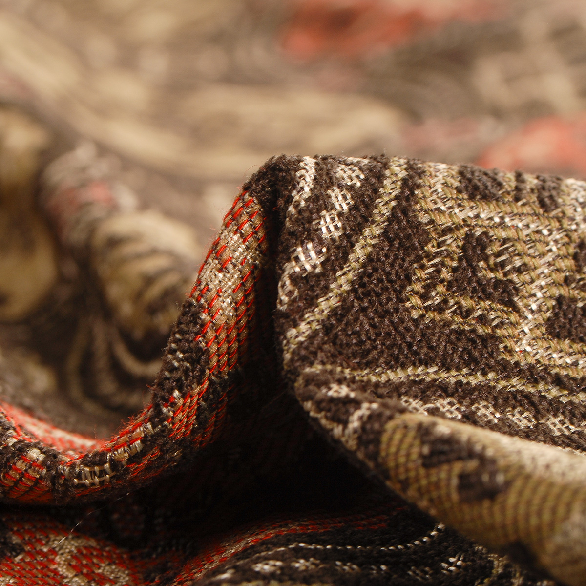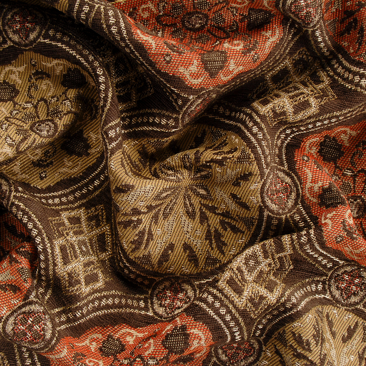 Dekorační žakárová látka se vzorem oválného květinového ornamentu v zemitých barvcáh odstínu zelené a hnědé s lehce sametovým žinylkovým povrchem. Dekorační látka je druh těžkého žakáru, má lehce plastický sametový omak a je vhodná i na zatemňovací závěs či drobné čalounění nábytku.