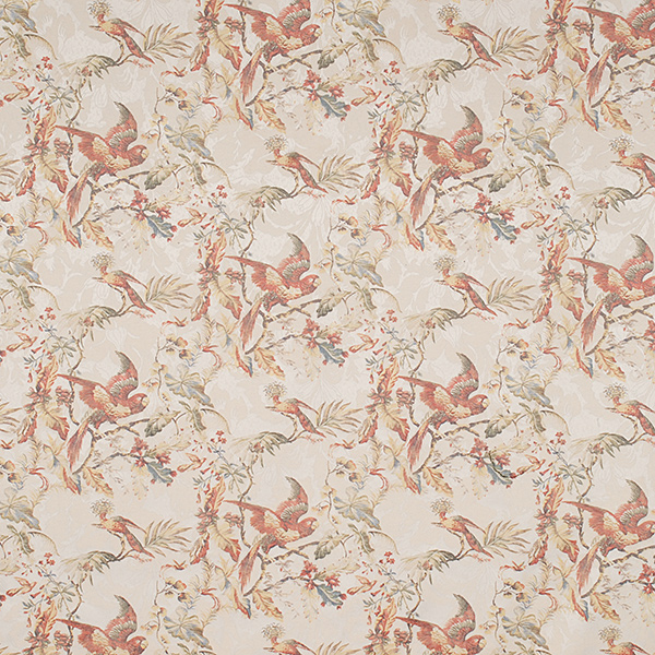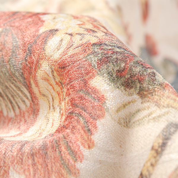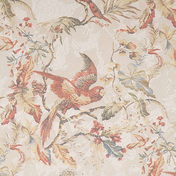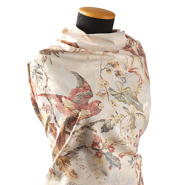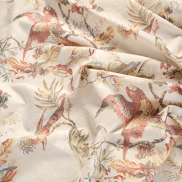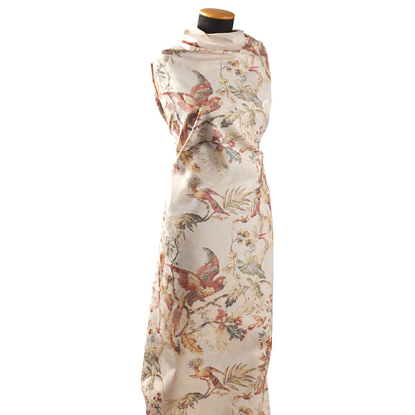 Originální žakárová látka s tiskem - digitální tisk s motivem papouška na žakárové tkanine se vzorem ornamentu v pastelových barvách. Látka je pevnější, ale poddajná, bude dobře držet tvar.Tato metráž patří do kolekce dvou látek se stejným vzorem žakárové tkaniny vhodné na kabát a šifonu vhodného na šaty.