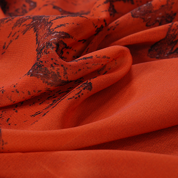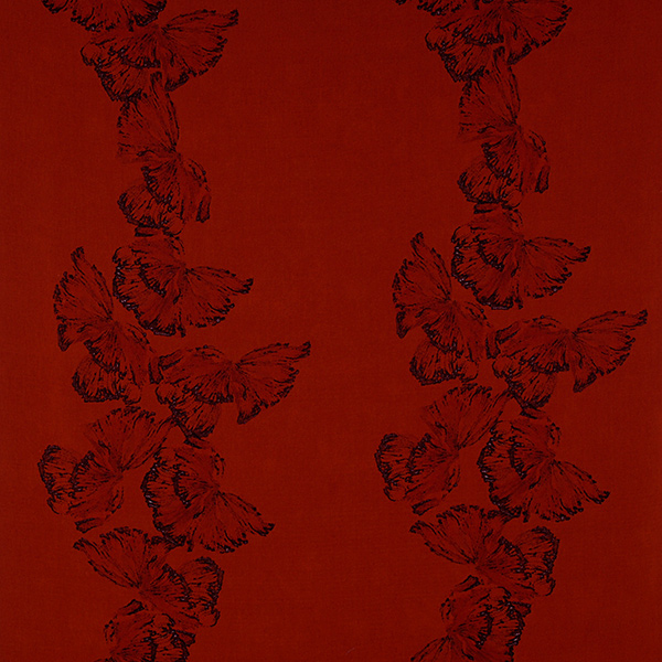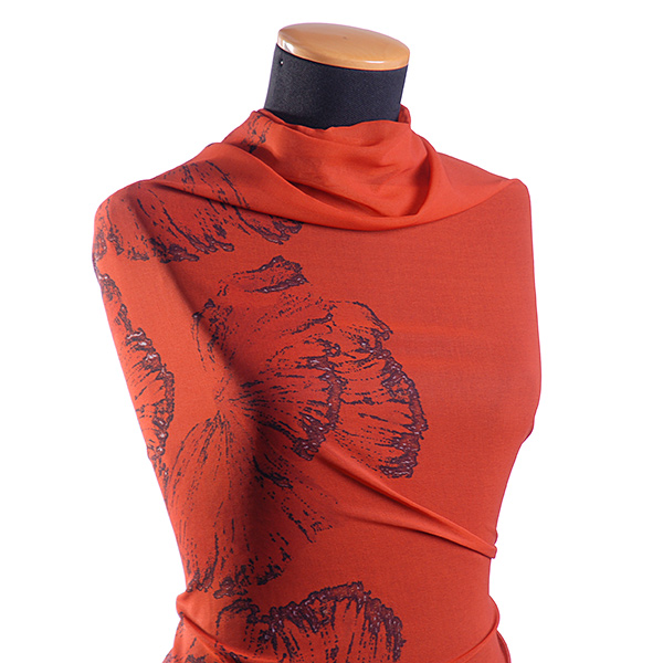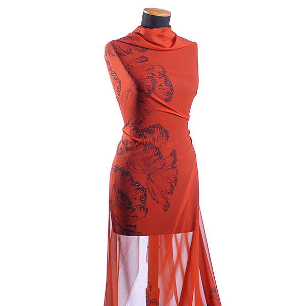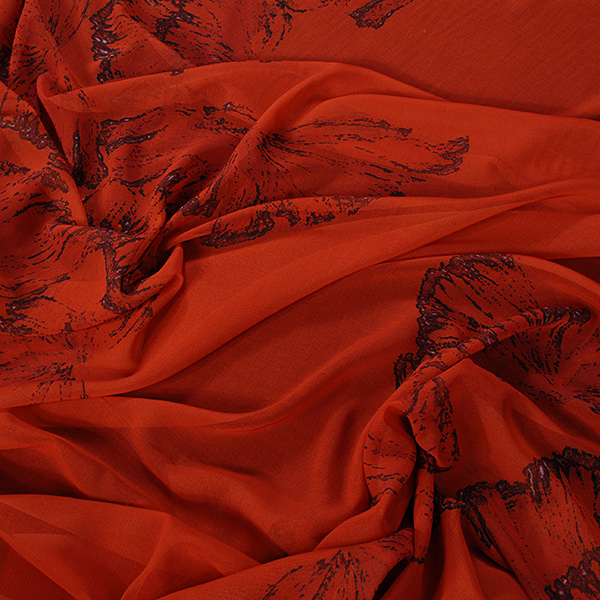 Žoržet průsvitná látka s motivem velkých květů vínově červené barvy na červeném podkladě. Vzor je digitálně tištěn na jemný žoržet. Látka je podobna šifonu, je průsvitná a splývavavější než šifon. Vzor se opakuje cca po 147 cm. Velikost květů je maximálně cca 58 cm.
