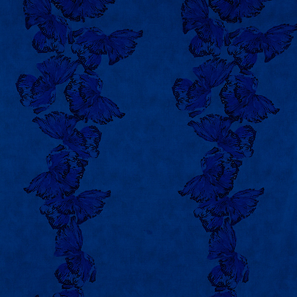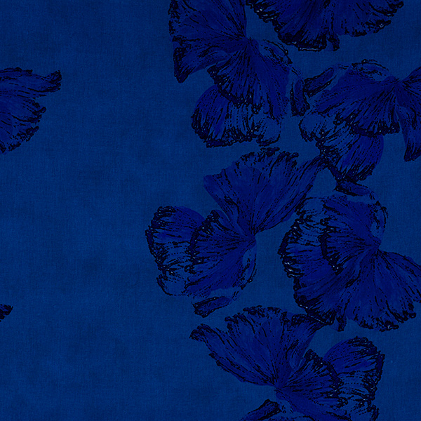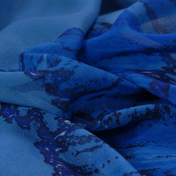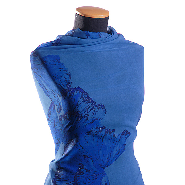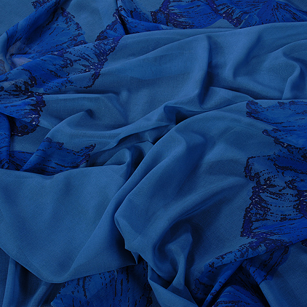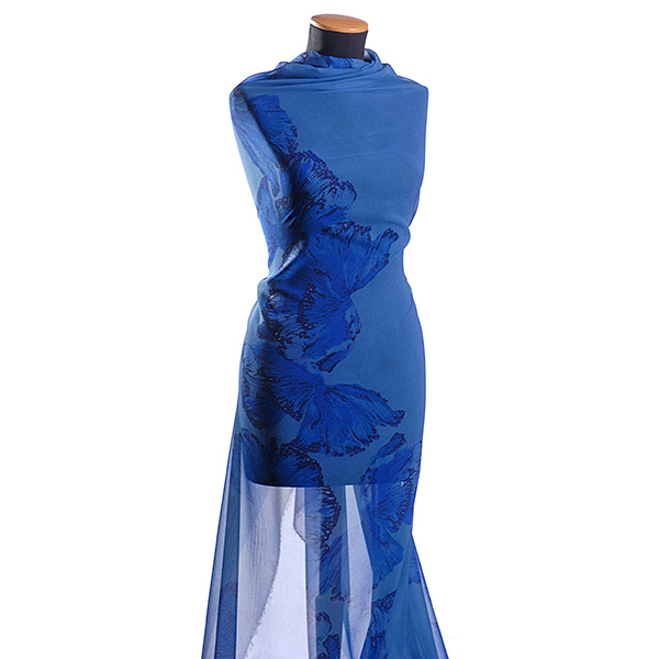 Žoržet průsvitná látka s motivem velkých květů modré barvy na světle modrém podkladě. Vzor je digitálně tištěn na jemný žoržet. Látka je podobna šifonu, je průsvitná a splývavavější než šifon. Vzor se opakuje cca po 147 cm. Velikost květů je maximálně cca 58 cm.