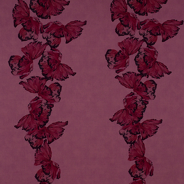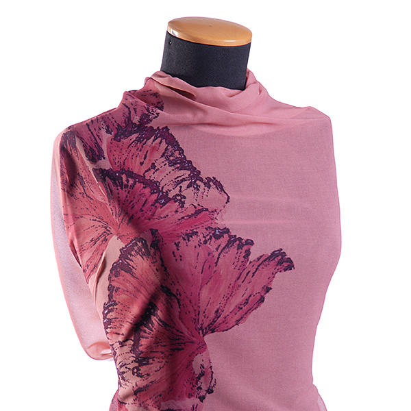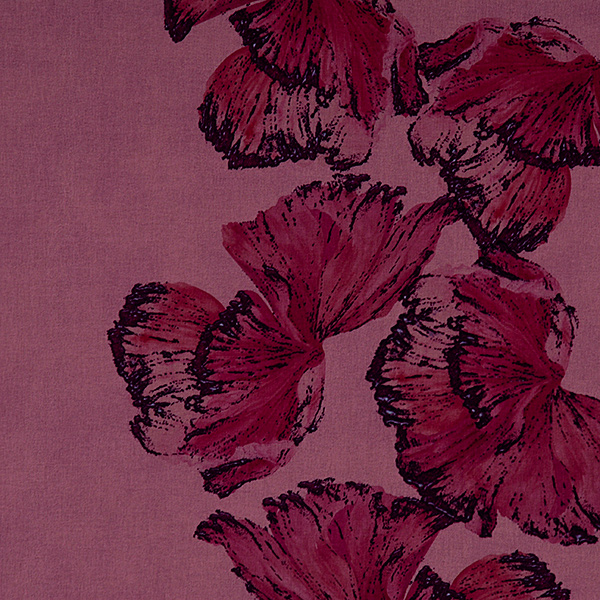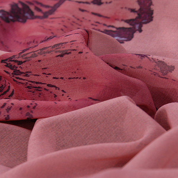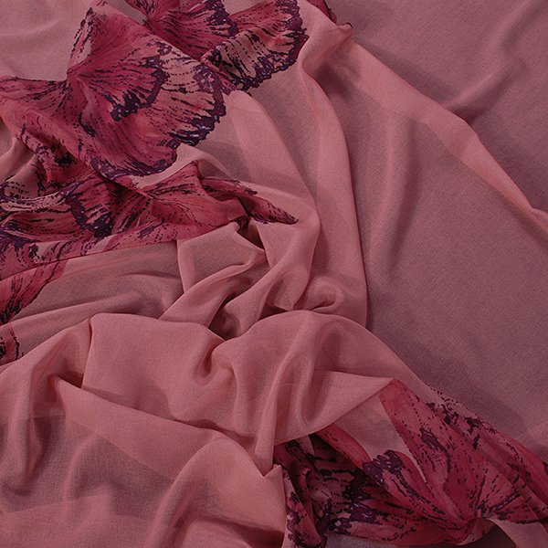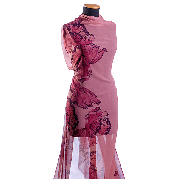 Žoržet průsvitná látka s motivem velkých květů vínově červené a růžové barvy na starorůžovém podkladě. Vzor je digitálně tištěn na jemný žoržet. Látka je podobna šifonu, je průsvitná a splývavavější než šifon. Vzor se opakuje cca po 147 cm. Velikost květů je maximálně cca 58 cm.
