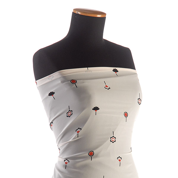Vzor: červenočerné květy na pastelově béžovém podkladu jsou velké cca 3x2 cm,květinový vzor na sebe navazuje po cca 10 cm..