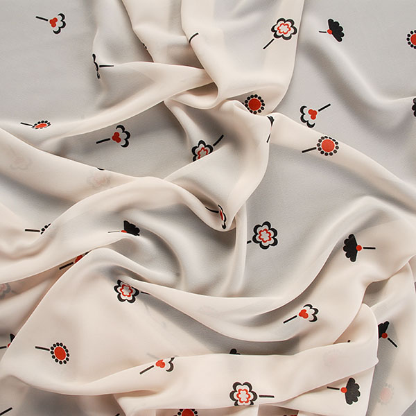 Žoržetová látka květy -žorřetováí látka s květinovým vzorem na pastelově béžovém podkladu.Žoržetová látka květy látka je bohatě splývavá, je průsvitná,není pružná . Žoržetová metráž dobře drží švy a je velmi oblíbená na elegantní vzdušné halenky, tuniky, šaty.