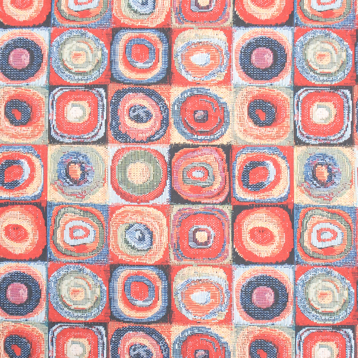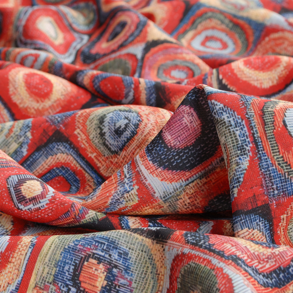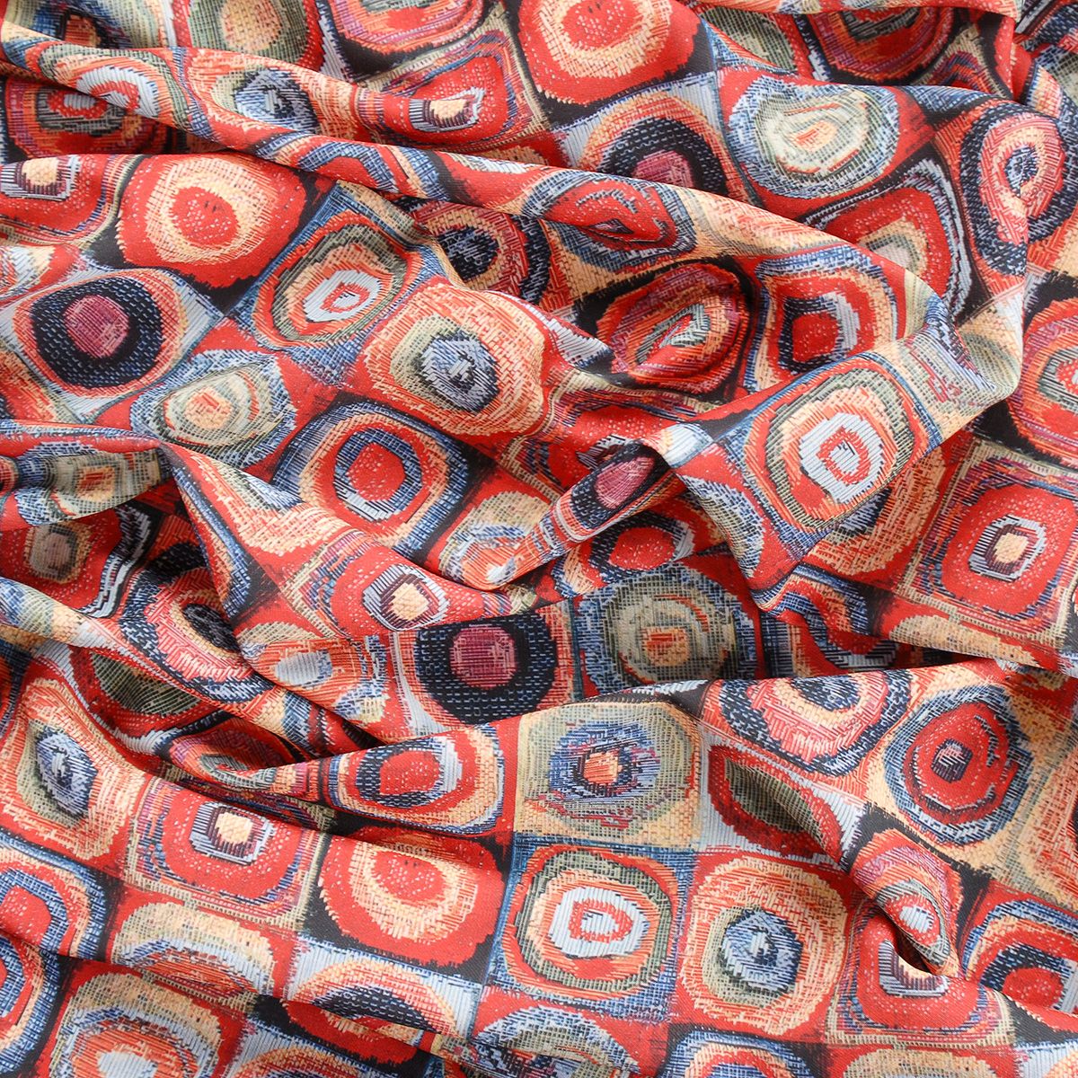 Jemná žoržetová pletenina s geometrickým vzorem barevných kruhů usazených ve čtverci s podkladem černé barvy. Látka má digitálně tištěný vzor, je splývavá, má matný lehce zrnitý povrch, je pružná v obou směrech po délce i šířce a téměř se nemačká.